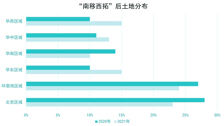 “根據(jù)地”北京及環(huán)渤海區(qū)域的土儲(chǔ)占比降低,分別由2020年的28%、27%,降至23%、24%,華南區(qū)域占比由14%降至10%。