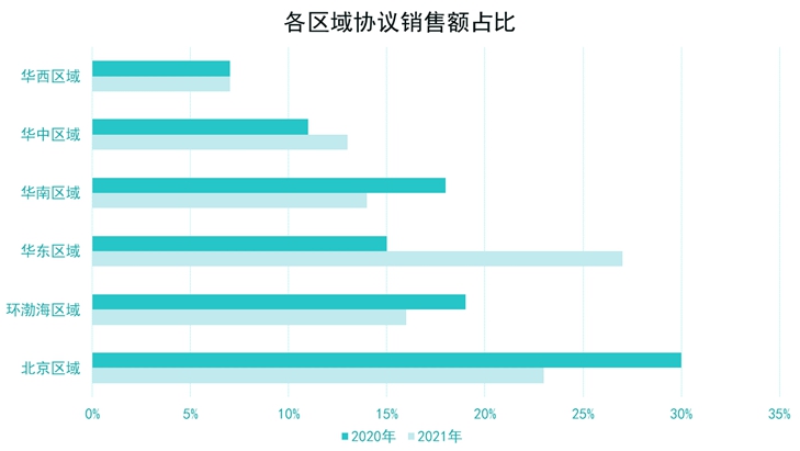 反映在銷售上,“南移西拓”區(qū)域的銷售額和占比均有明顯提升。從2021年數(shù)據(jù)來(lái)看,北京、環(huán)渤海區(qū)域銷售額占比同比下降,兩大區(qū)域總協(xié)議銷售額2020年占比達(dá)49%,這一數(shù)字在2021年降至39%。