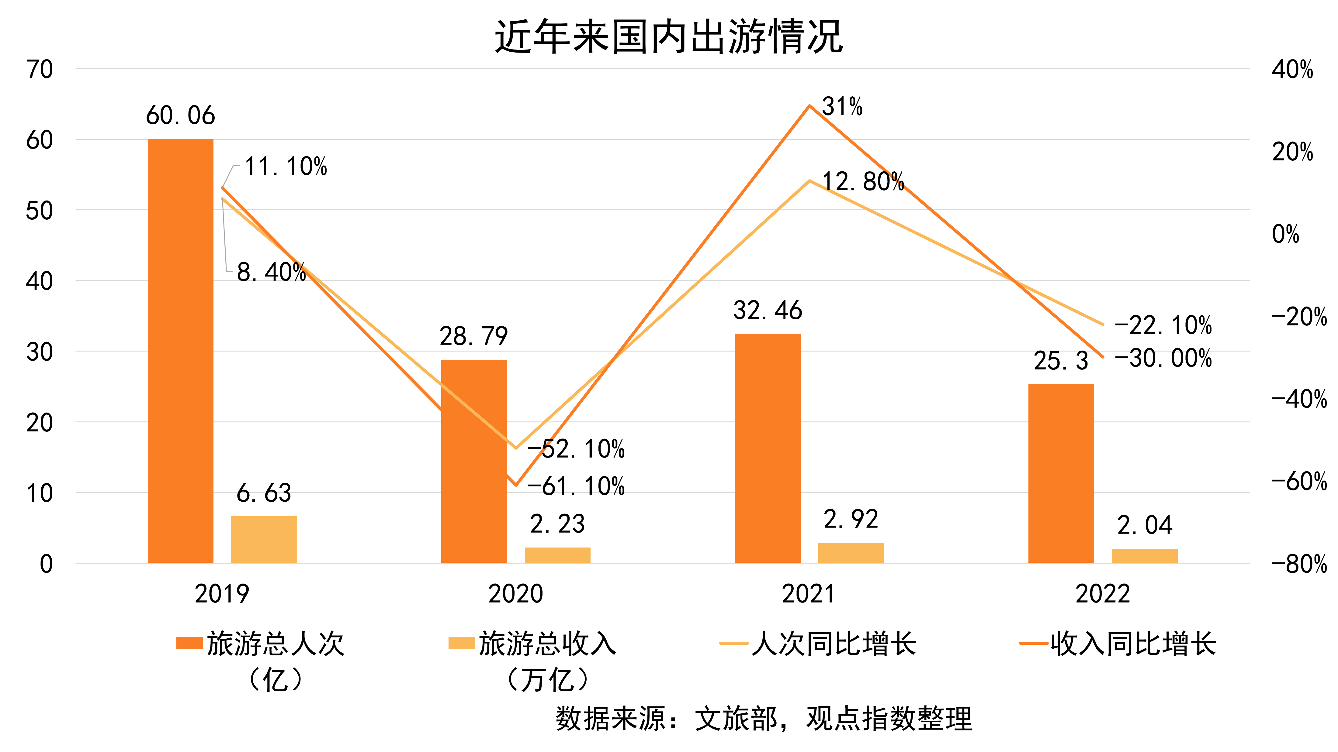 對比2021年,國內(nèi)旅游總?cè)舜魏涂偸杖攵间浀靡欢ǚ鹊南陆?,其中前者下?2.1%,后者則錄得30%下跌。2022年全年,前述兩個指標(biāo)絕對值甚至不及2019年的一半,宏觀數(shù)據(jù)腰斬。