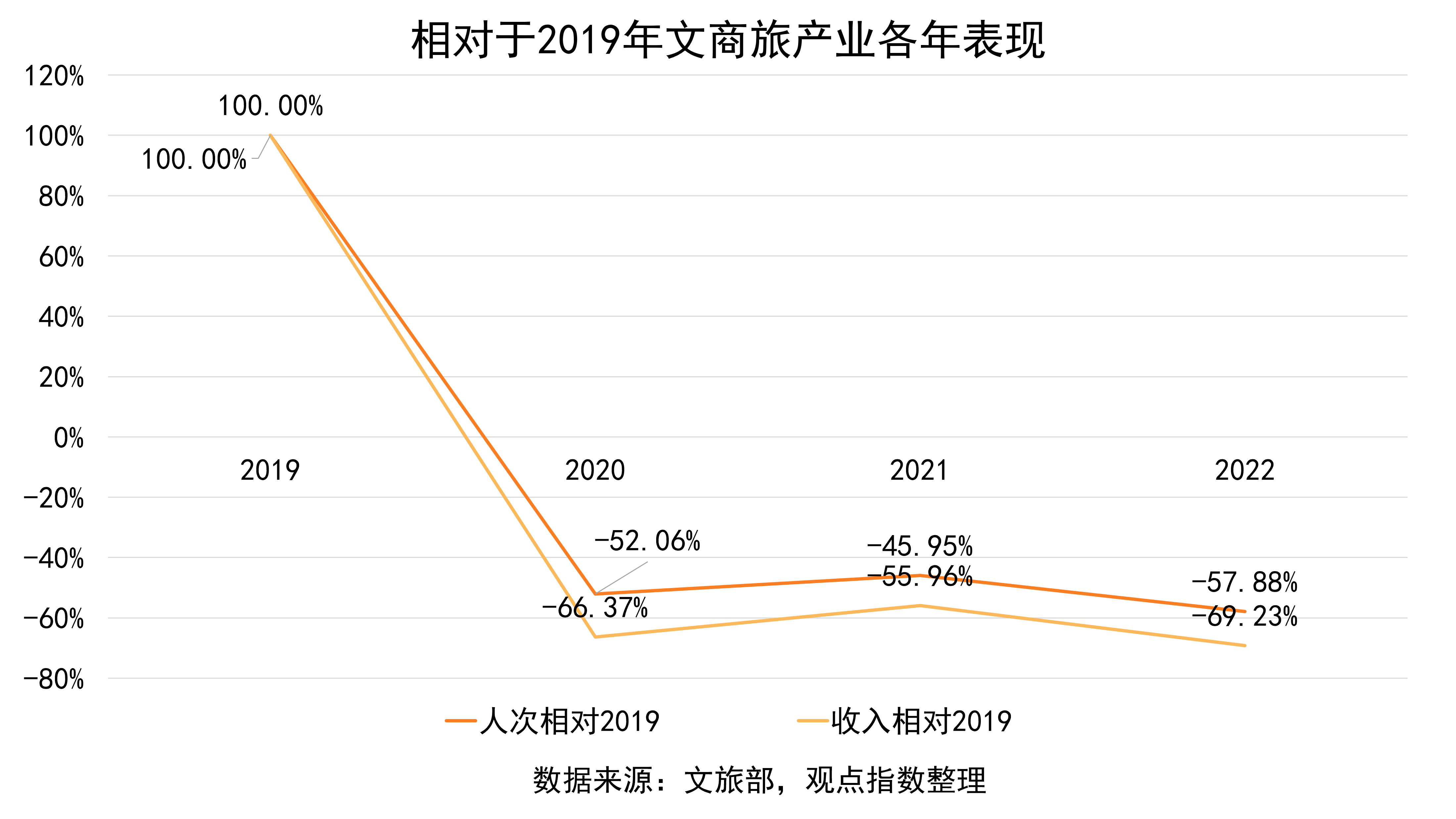 以疫情前的2019年數(shù)據(jù)為基準(zhǔn),從旅游總收入和旅游總?cè)舜蜗鄬Π俜直葋砜矗?022年的文商旅行業(yè)走在了最低谷。