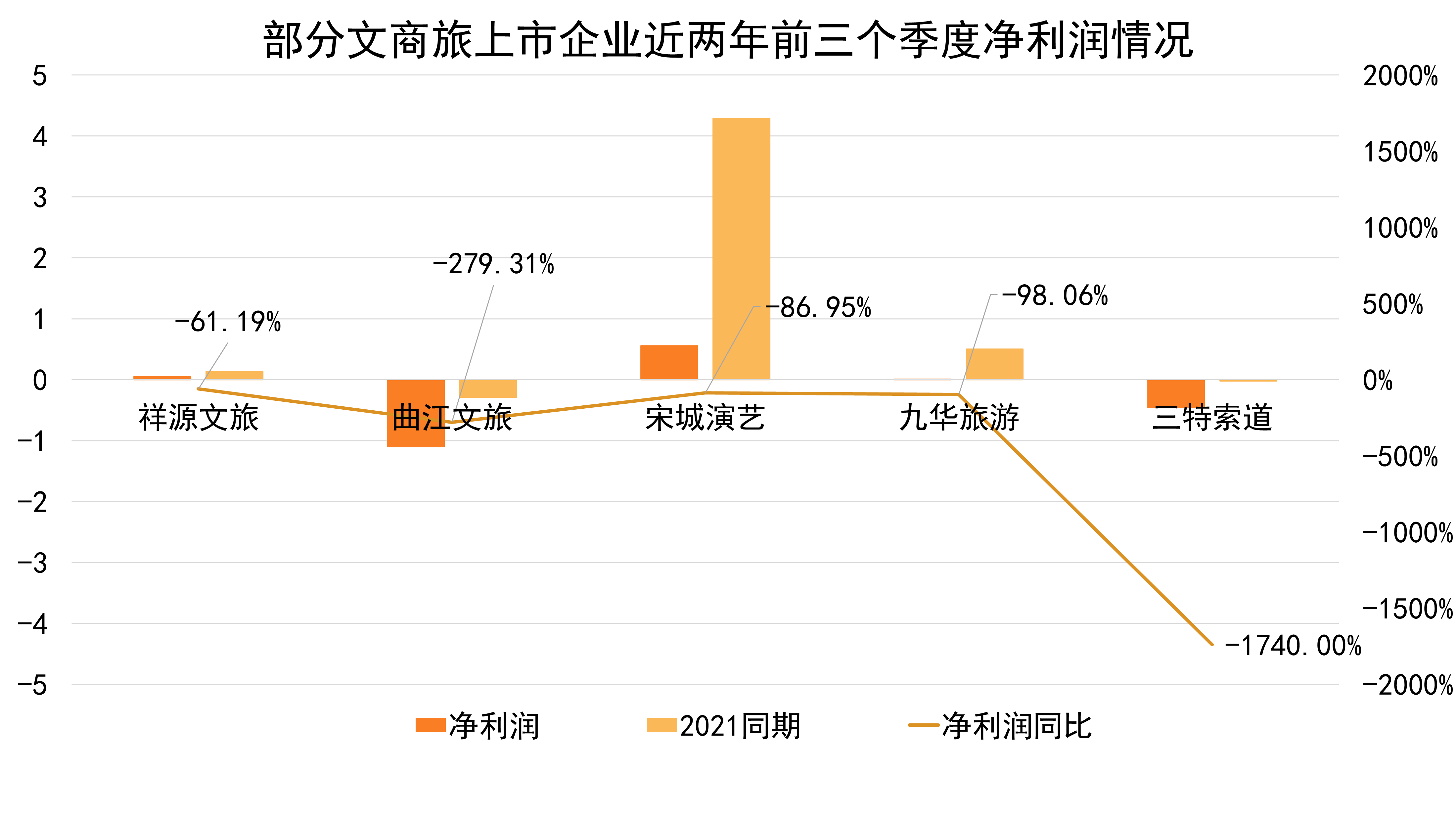 宋城演藝發(fā)出的2022年業(yè)績預(yù)告顯示,歸母凈利潤為0.075億元至0.11億元,同比下降96.43%-97.62%,勉強維持盈虧平衡;同樣凈利潤近乎被抹平的還有九華旅游,跌去98.06%。