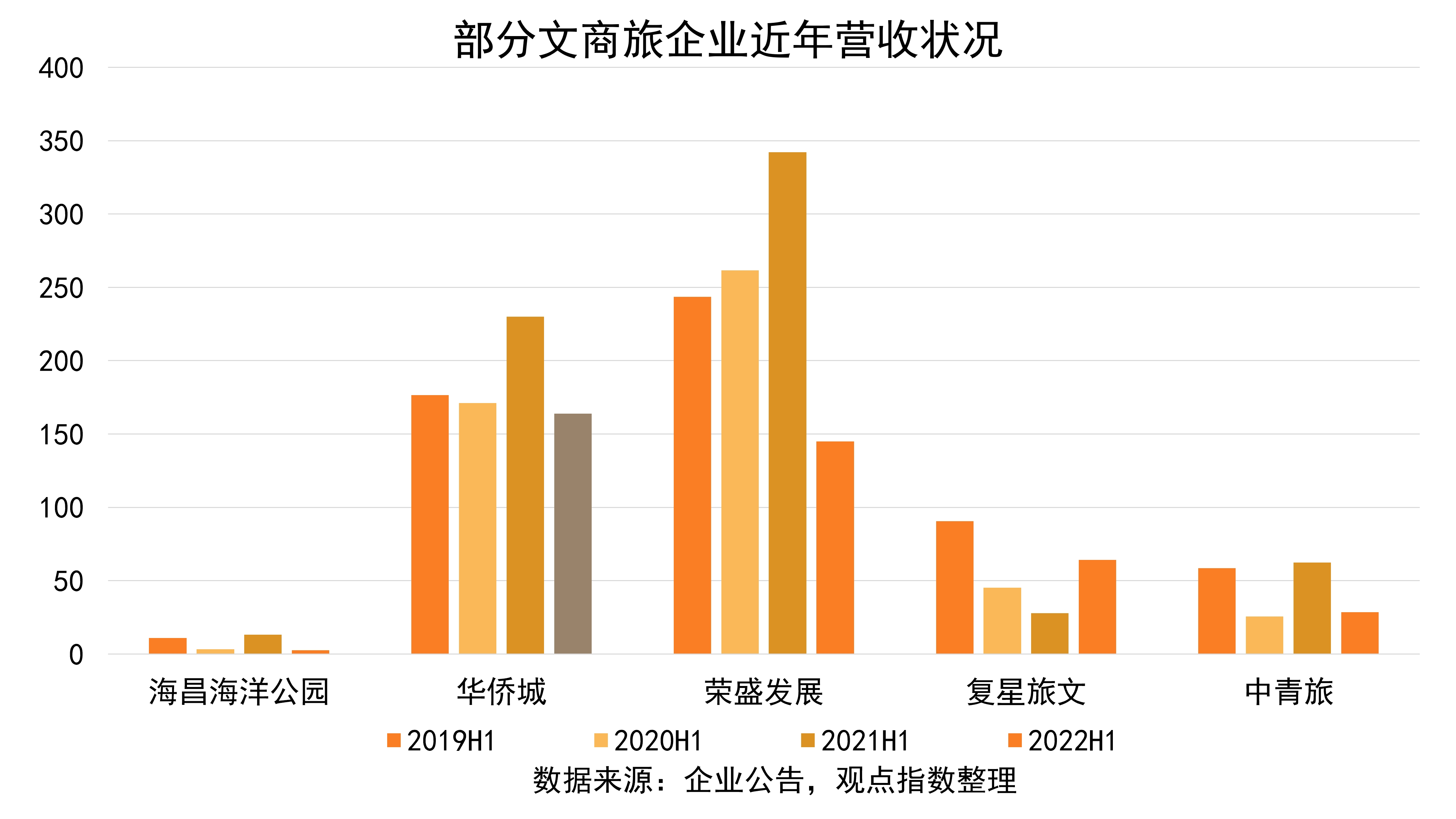 在疫情前、疫情間的2019-2021三年間,華僑城與榮盛的營收整體維持在同一水平,在疫情控制良好的2021年還有著不低幅度的增長。即使2022年上半年疫情較為嚴(yán)重時期,華僑城的營收也依舊與2019年和2020年持平。業(yè)務(wù)更加多元化的文商旅樣本企業(yè),總體抗風(fēng)險能力更強,一定程度上對沖了受到的影響。