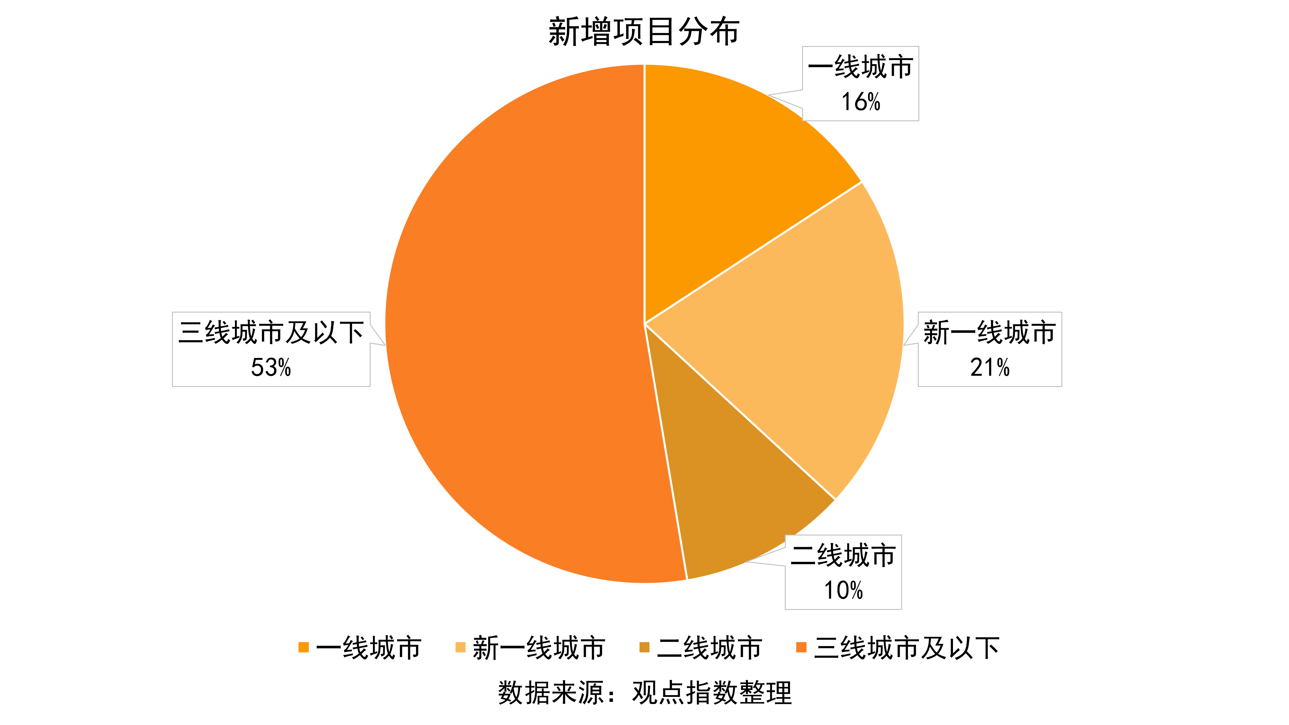 新增項目主要分布在三線城市及以下,占比超過50%。