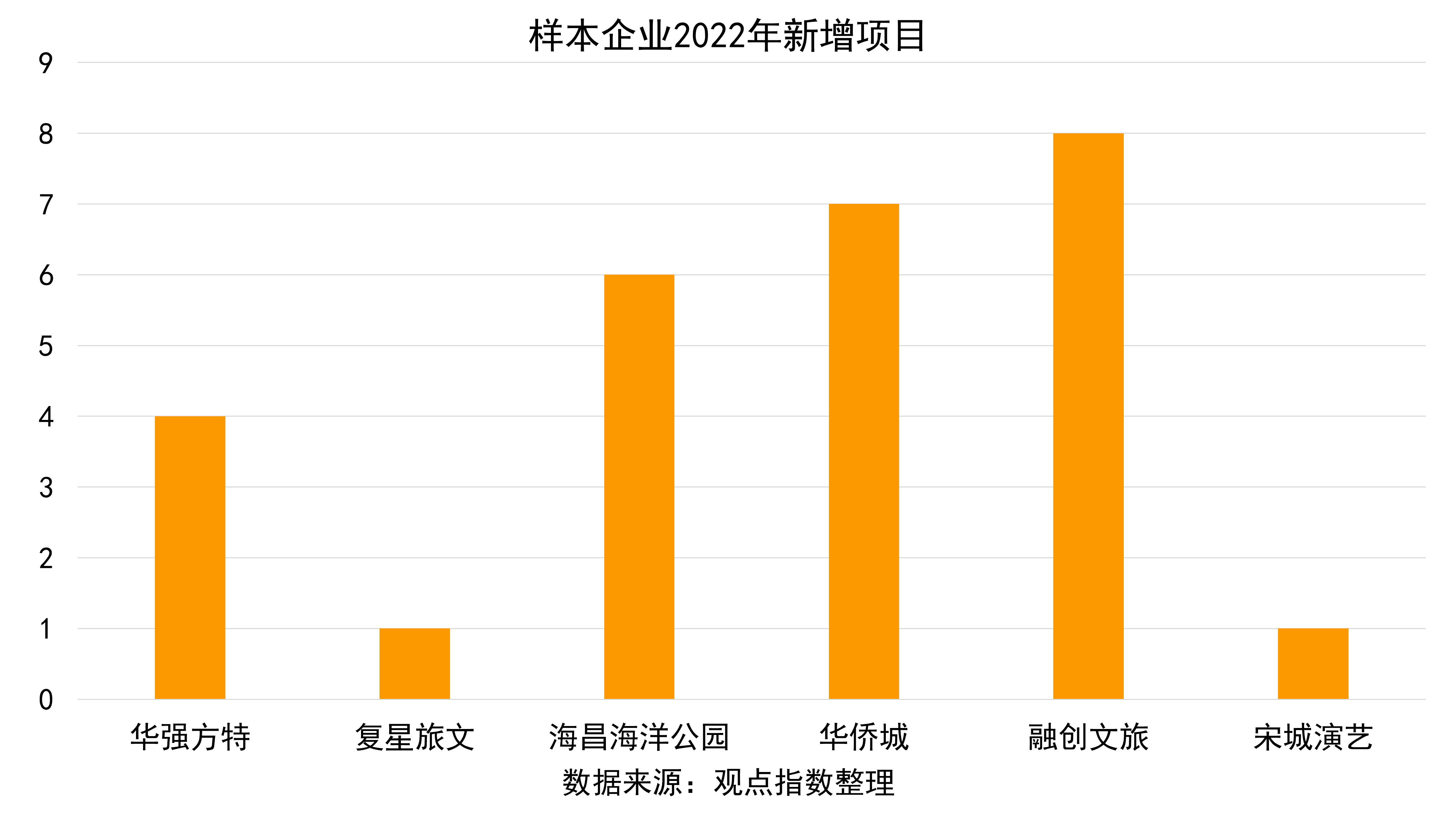 報告期內(nèi),樣本企業(yè)中融創(chuàng)文旅的新增項目數(shù)量最多,達(dá)到8個,均以輕資產(chǎn)的形式輸出,同時均為冰雪經(jīng)濟相關(guān)的項目,包括熱雪奇跡品牌線項目輸出以及長白山等冰雪旅游地區(qū)的酒店及景區(qū)管理。在冰雪主題相關(guān)的文商旅項目運營方面,融創(chuàng)已走在國內(nèi)前列。