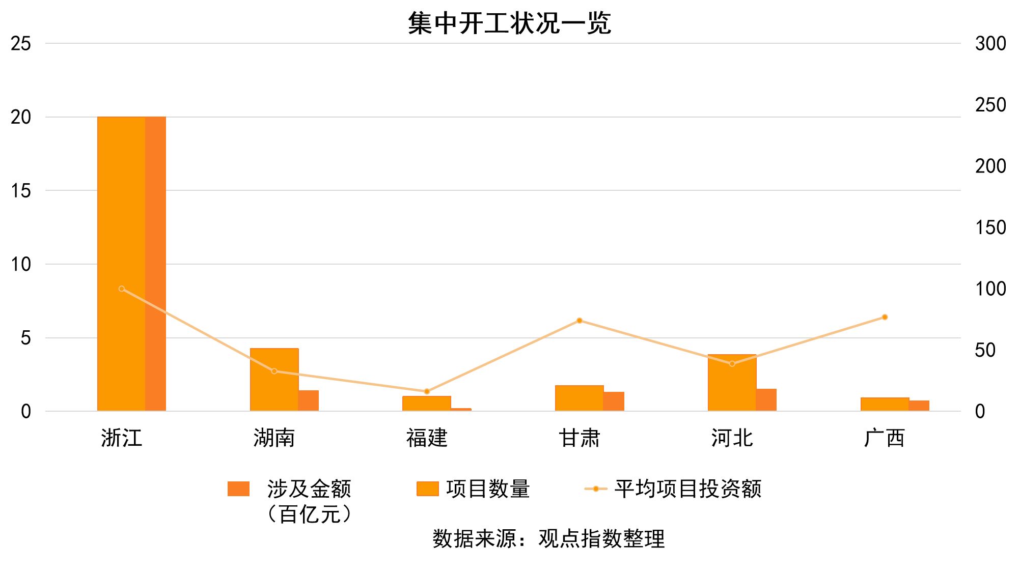 作為對比,廣西地區(qū)僅錄得11個項目開工,總投資額7000萬元。新開工項目數(shù)量緊隨其后的為湖南省與河北省,甘肅省和廣西省平均項目投資額達(dá)到6億元水平,僅次于浙江地區(qū)。