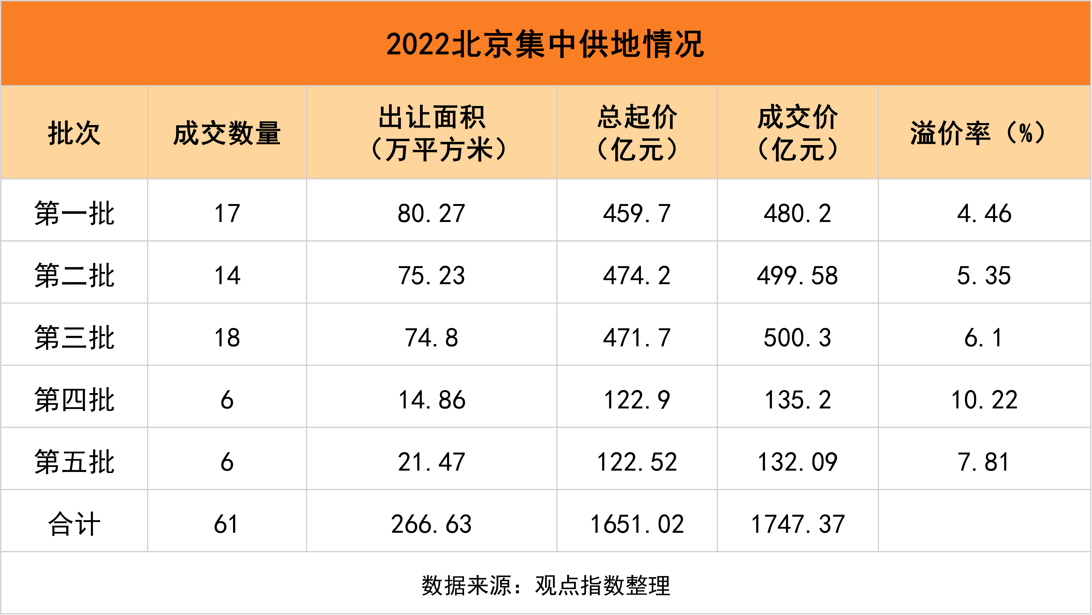 據(jù)觀點指數(shù)監(jiān)測統(tǒng)計,2022全年北京5批集中供地一共有61宗地塊成交,出讓面積266.63萬平方米,總成交價合計1747.37億元,成交樓面均價34753.54元/平方米(2021年為30898元/平方米)。