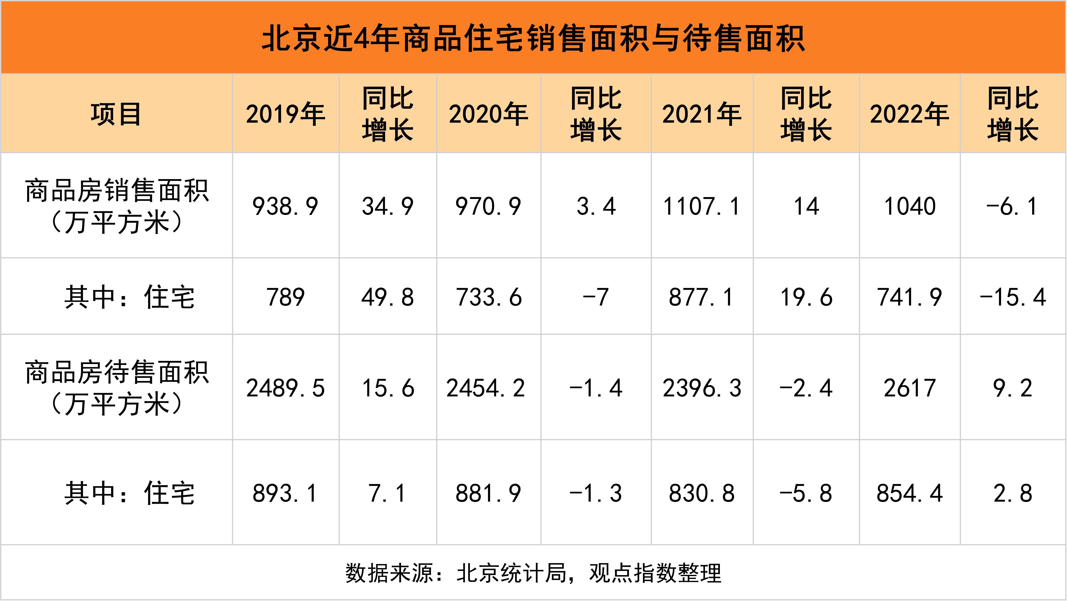 從銷售數(shù)據(jù)看,2022年北京全市商品房銷售面積為1040萬平方米,同比下降6.1%。其中,住宅銷售面積為741.9萬平方米,下降15.4%。雖然同比降幅較大,但是整體住宅銷售面積與2020年、2019年持平。