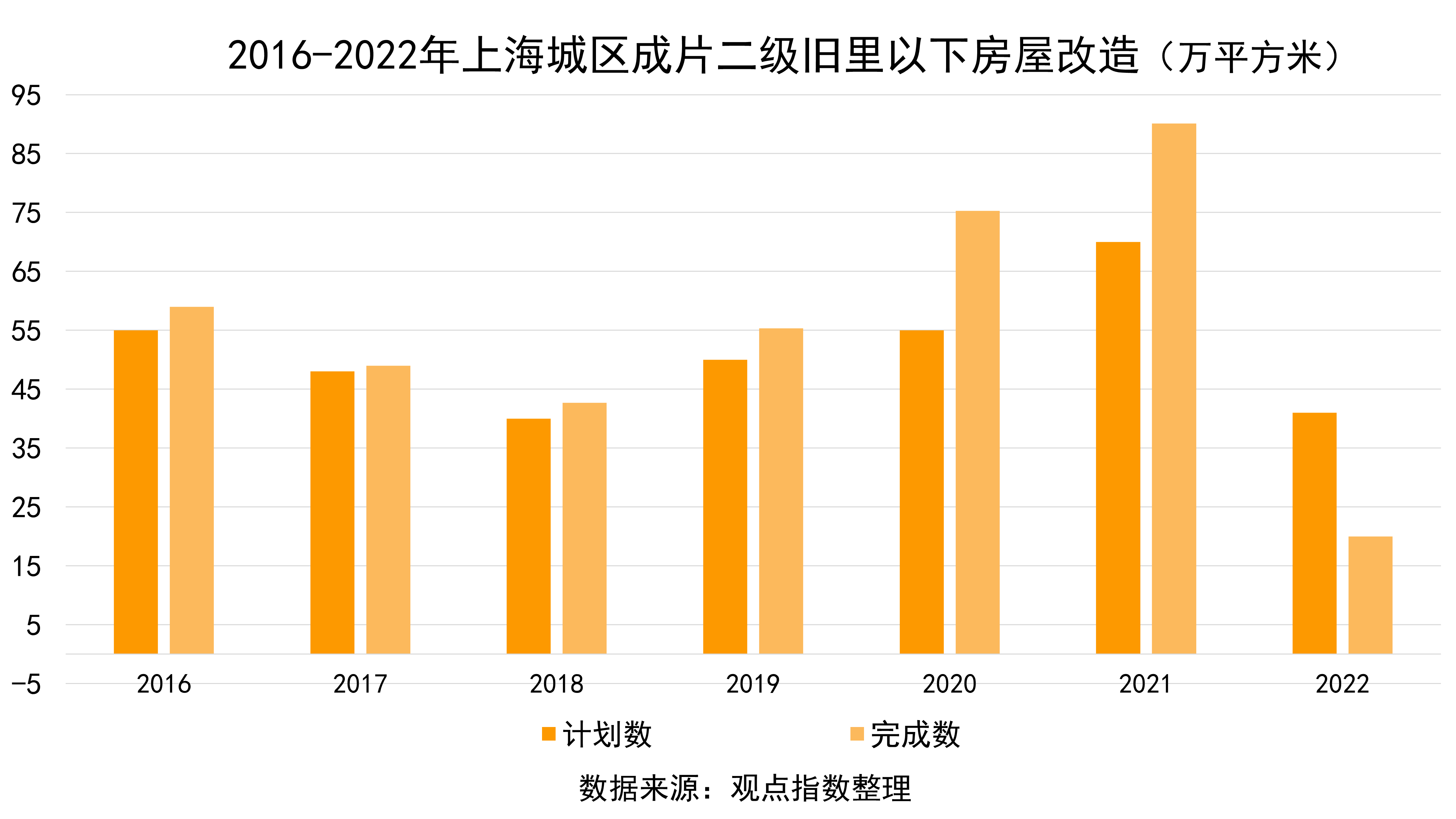 上海市房屋管理局表示,2022年1-11月上海共完成24.51萬平方米、0.61萬戶的"小梁薄板"房屋等不成套舊住房改造,超額完成20萬平方米的改造年度目標(biāo)。觀點(diǎn)指數(shù)認(rèn)為,舊住房成套改造在一定程度上可以補(bǔ)充住宅需求。