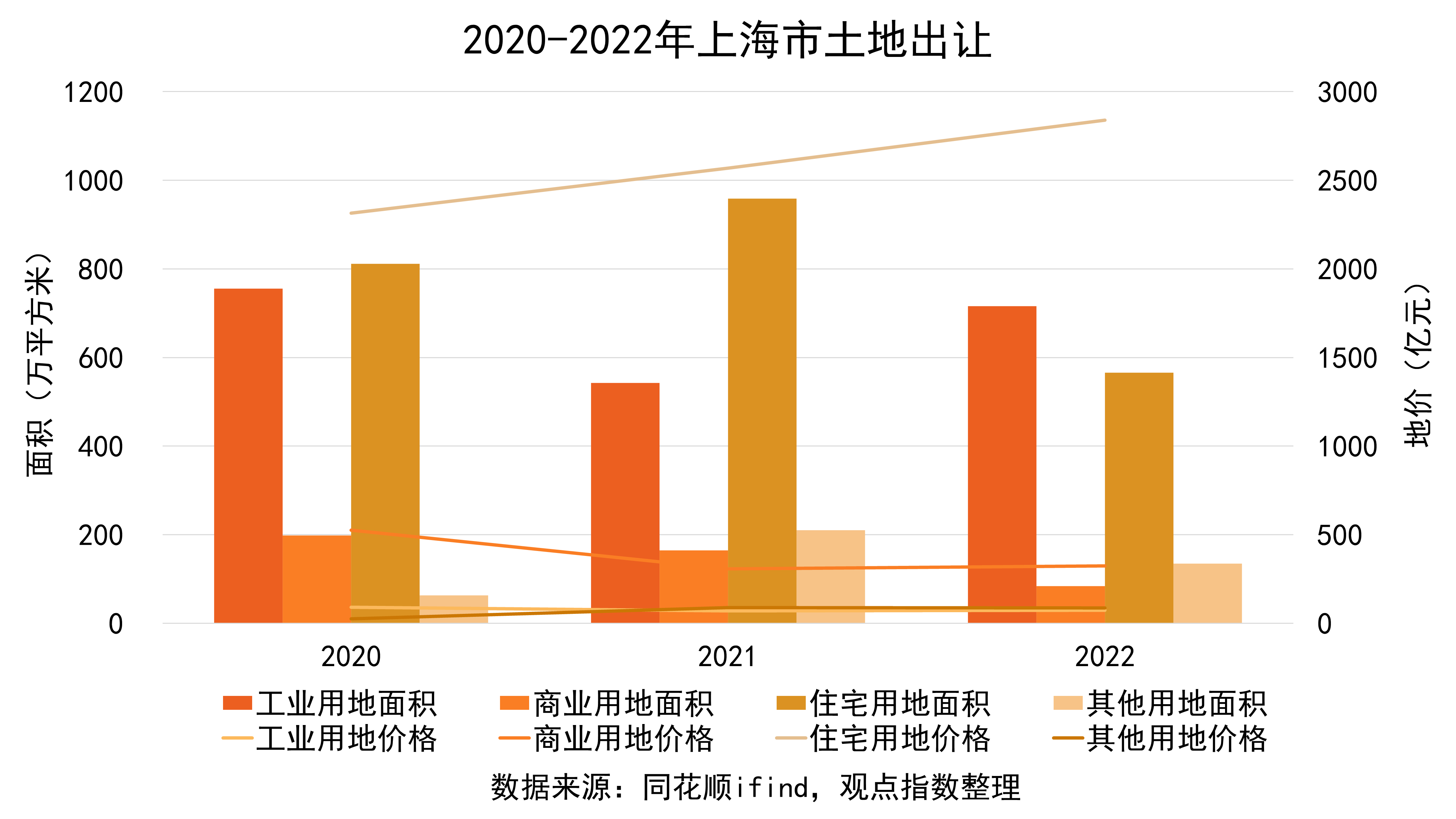 觀點(diǎn)指數(shù)觀察到,涉宅地塊、工業(yè)用地、商業(yè)用地的地塊面積都有不同程度下降,但是地塊價(jià)格均上升,可見本年度出讓地塊價(jià)值較高。要關(guān)注到的是,在遭受疫情重創(chuàng)后還能保持地價(jià)收入不降反增,這也體現(xiàn)了上海土地市場(chǎng)的韌性。