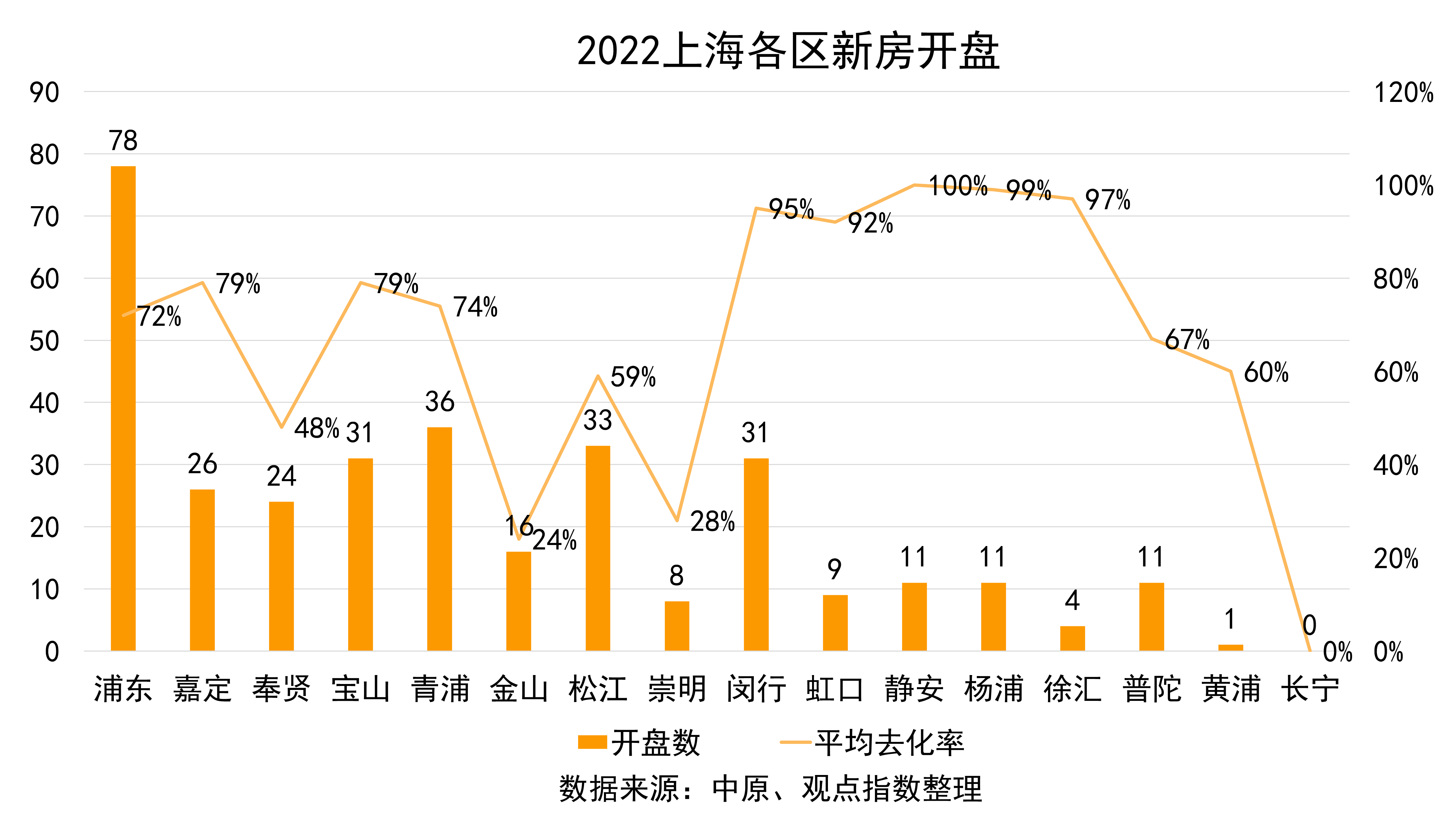 據(jù)中原數(shù)據(jù)顯示,2022年上海新房市場(chǎng)推出樓盤開盤當(dāng)日去化率共計(jì)7.4萬套,整體去化率為71%左右,同比下降9%。