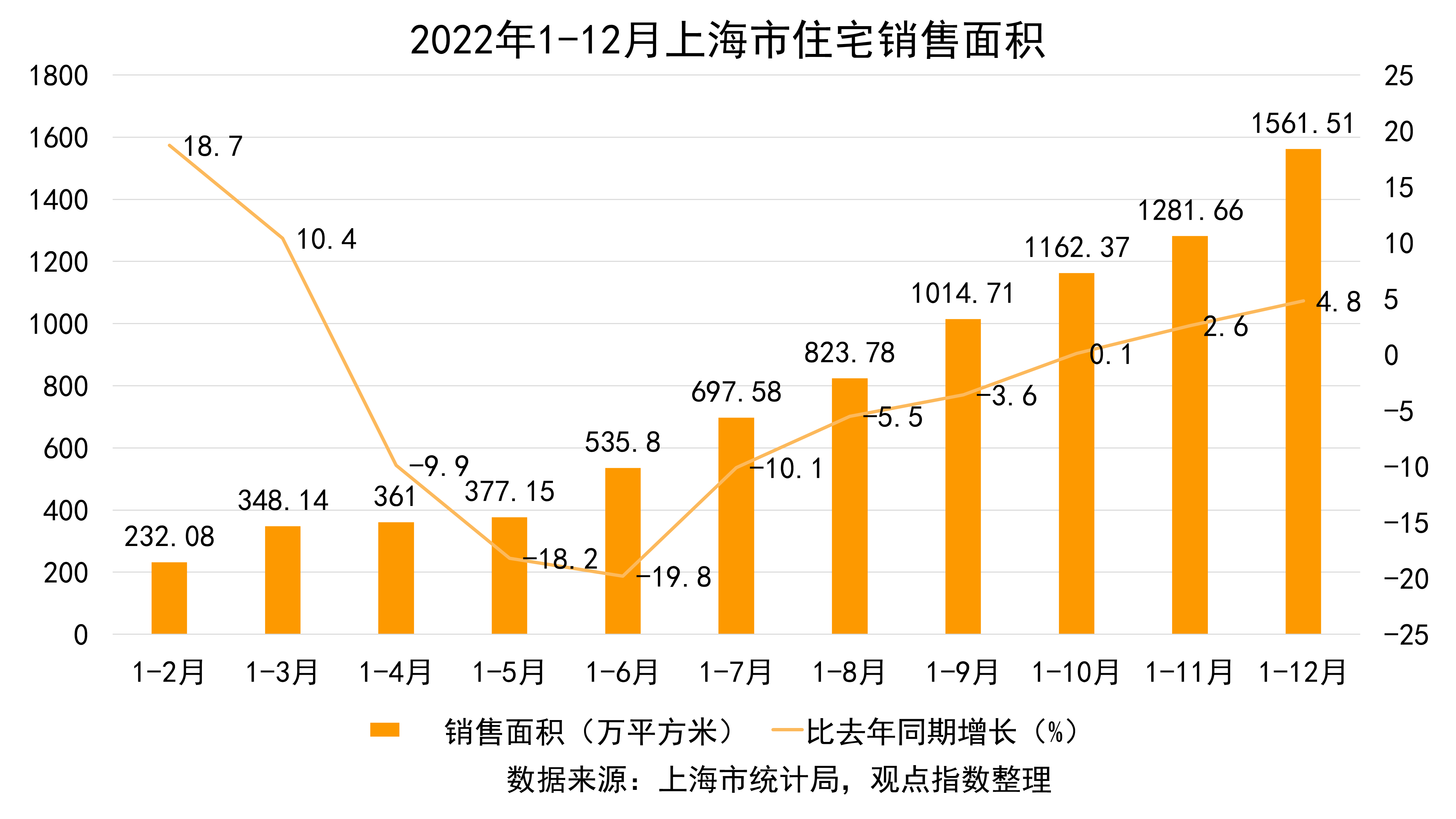 2022年,上海市商品房銷售面積1852.88萬平方米,下降1.5%。其中,住宅銷售面積1561.51萬平方米,增長4.8%。
