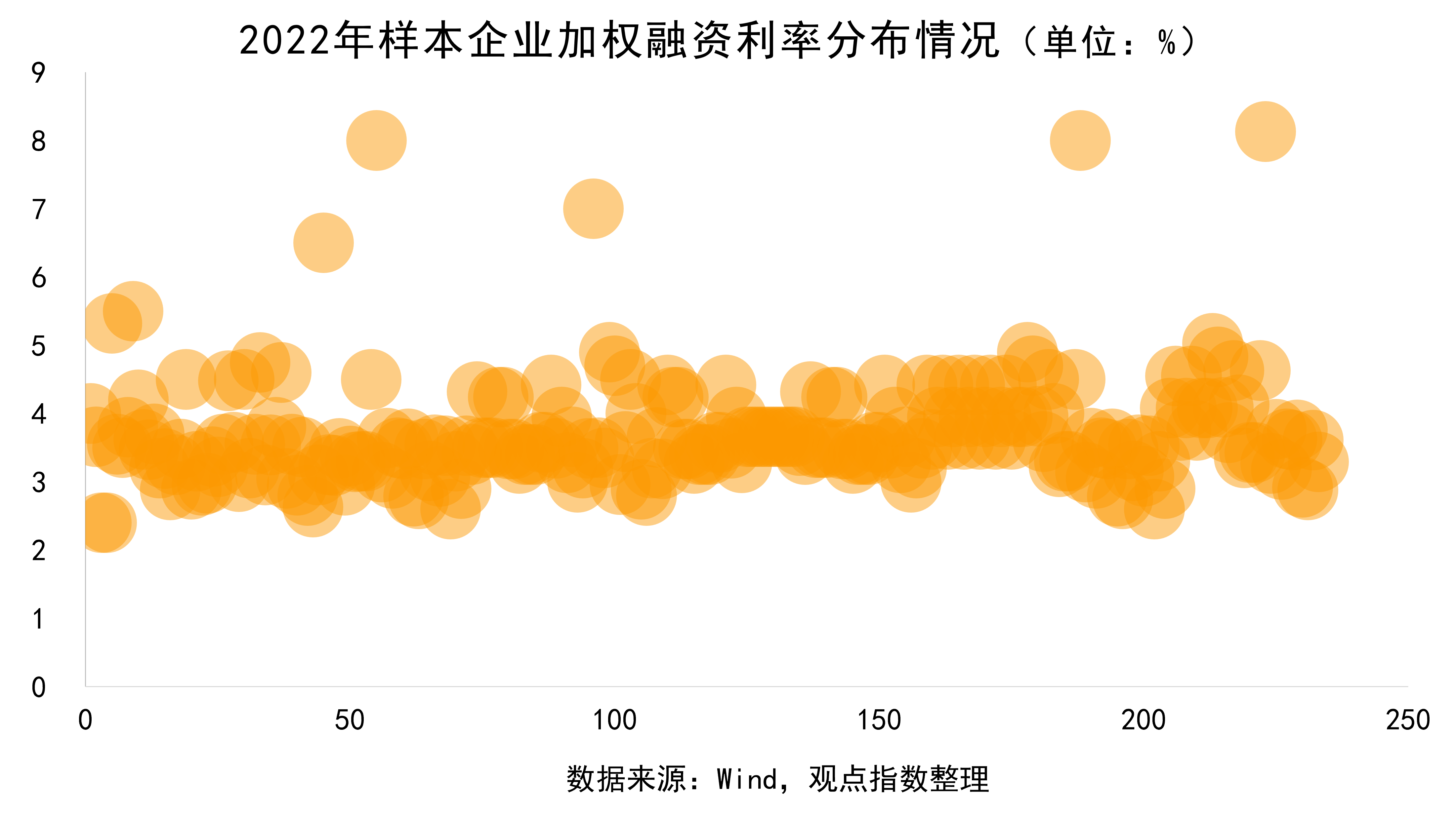 從數(shù)據(jù)上看,2022年出現(xiàn)“極大值”(超過7%)融資利率的債券數(shù)量銳減至個位數(shù),這在很大程度上抑制了整體均值的上升。另一方面,對于出險企業(yè)而言,這也預(yù)示著他們的融資通道日益萎縮。接近85%的數(shù)據(jù)分布在3%-4%區(qū)間內(nèi),主要是大部分債券發(fā)行主體是央國企以及信譽良好的民企。