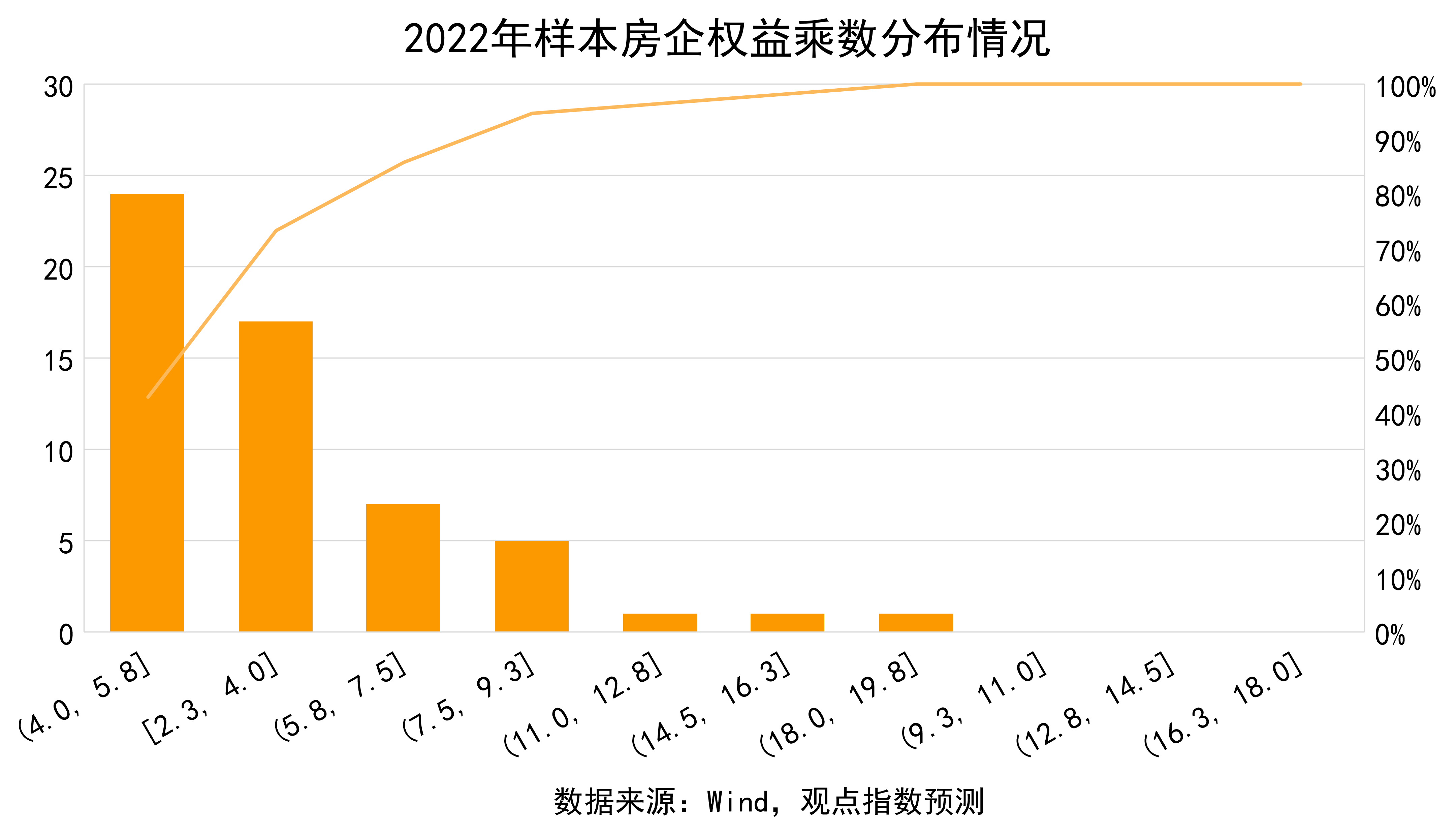 另一方面,從企業(yè)的資產(chǎn)結(jié)構(gòu)來看,絕大部分房企的負(fù)債比例依舊居于高位。2022年樣本企業(yè)的權(quán)益乘數(shù)均值為5.5,即接近80%的負(fù)債率。