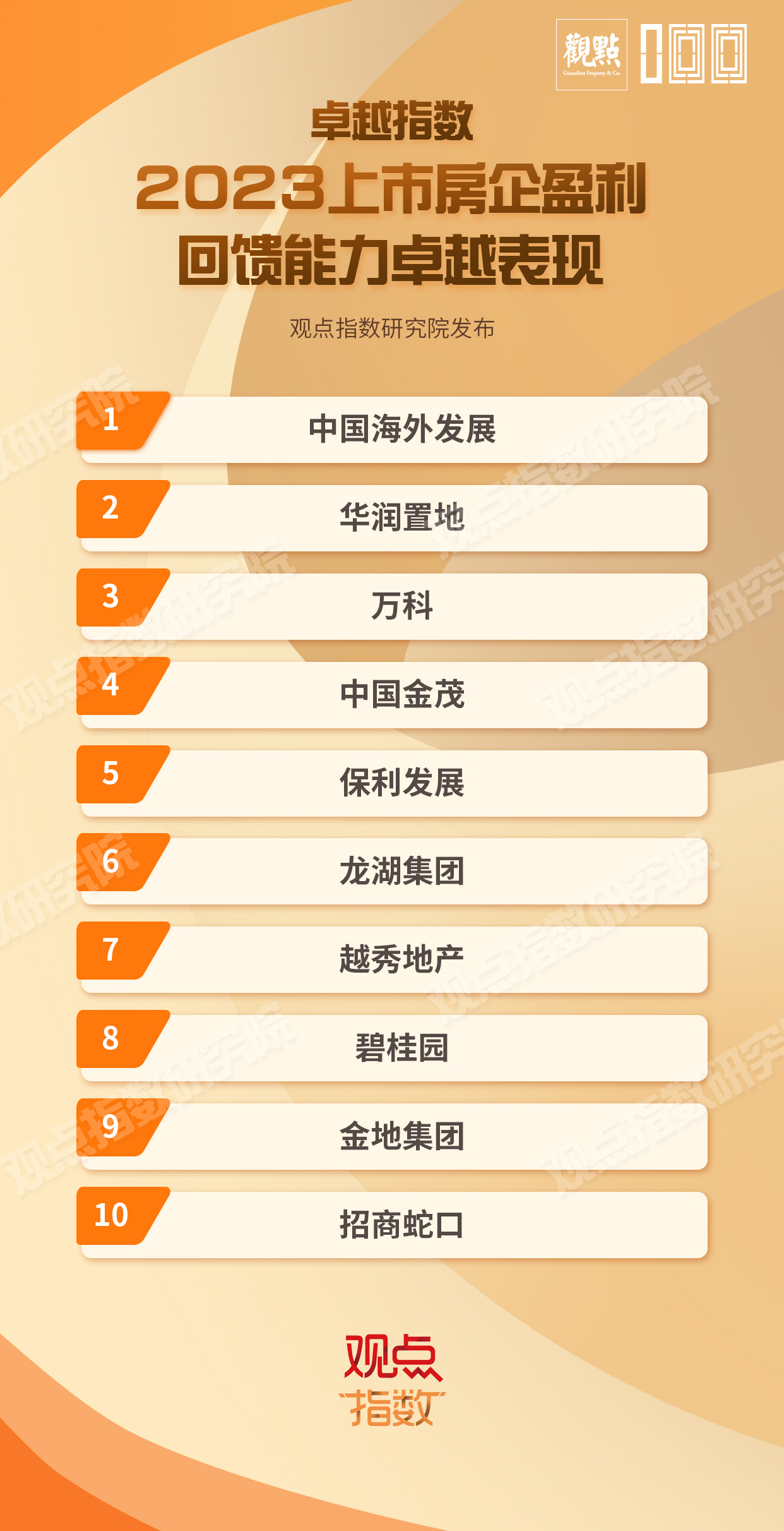 以下為其中的《2023上市房企盈利回饋能力卓越表現(xiàn)報(bào)告》及研究成果,更多請(qǐng)點(diǎn)擊2023觀點(diǎn)房地產(chǎn)卓越指數(shù) - 觀點(diǎn)網(wǎng) (guandian.cn)