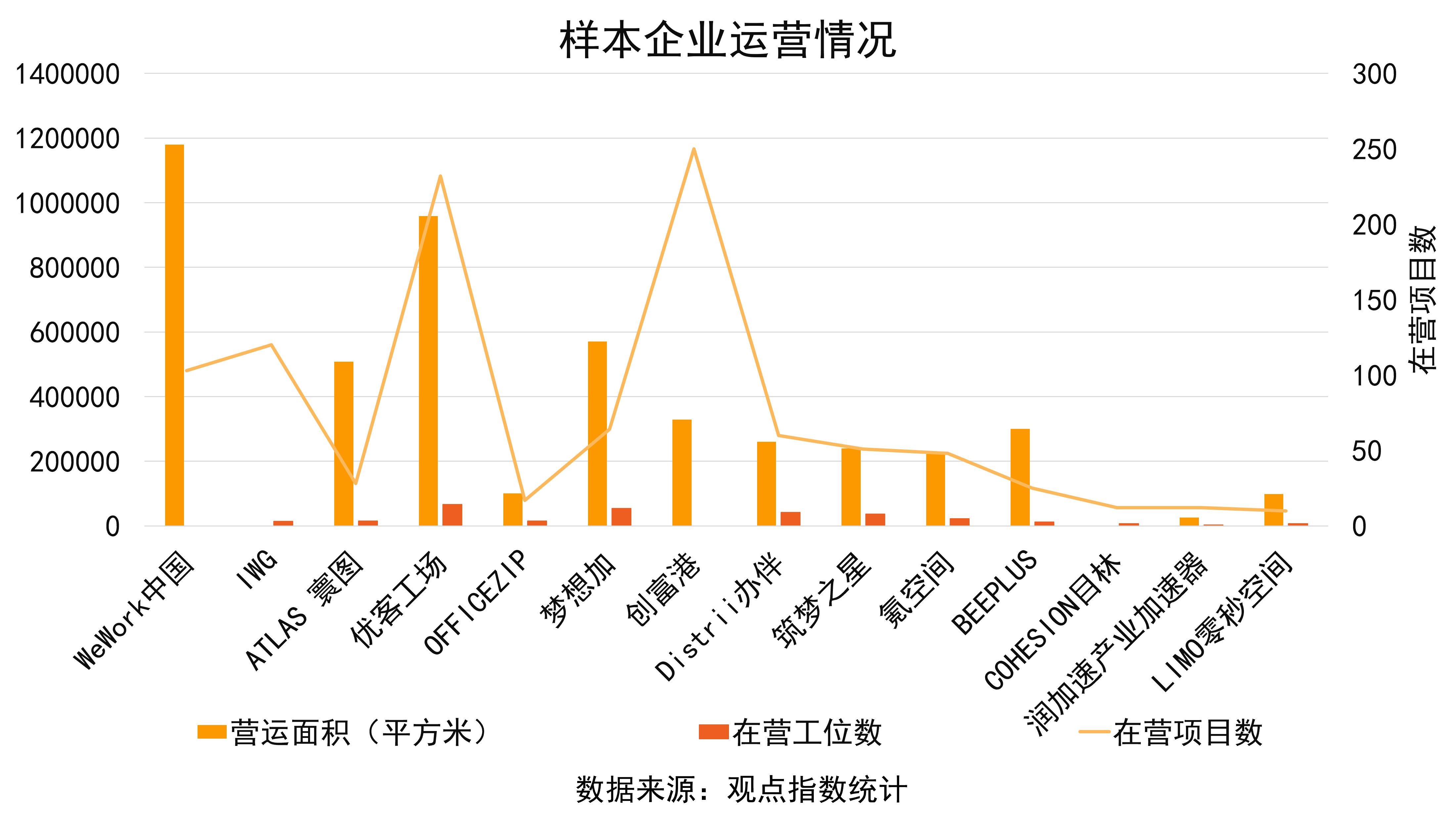 項(xiàng)目開業(yè)方面,觀點(diǎn)指數(shù)選取19家辦公空間服務(wù)企業(yè)作為樣本企業(yè),監(jiān)測辦公空間產(chǎn)品的開業(yè)情況。