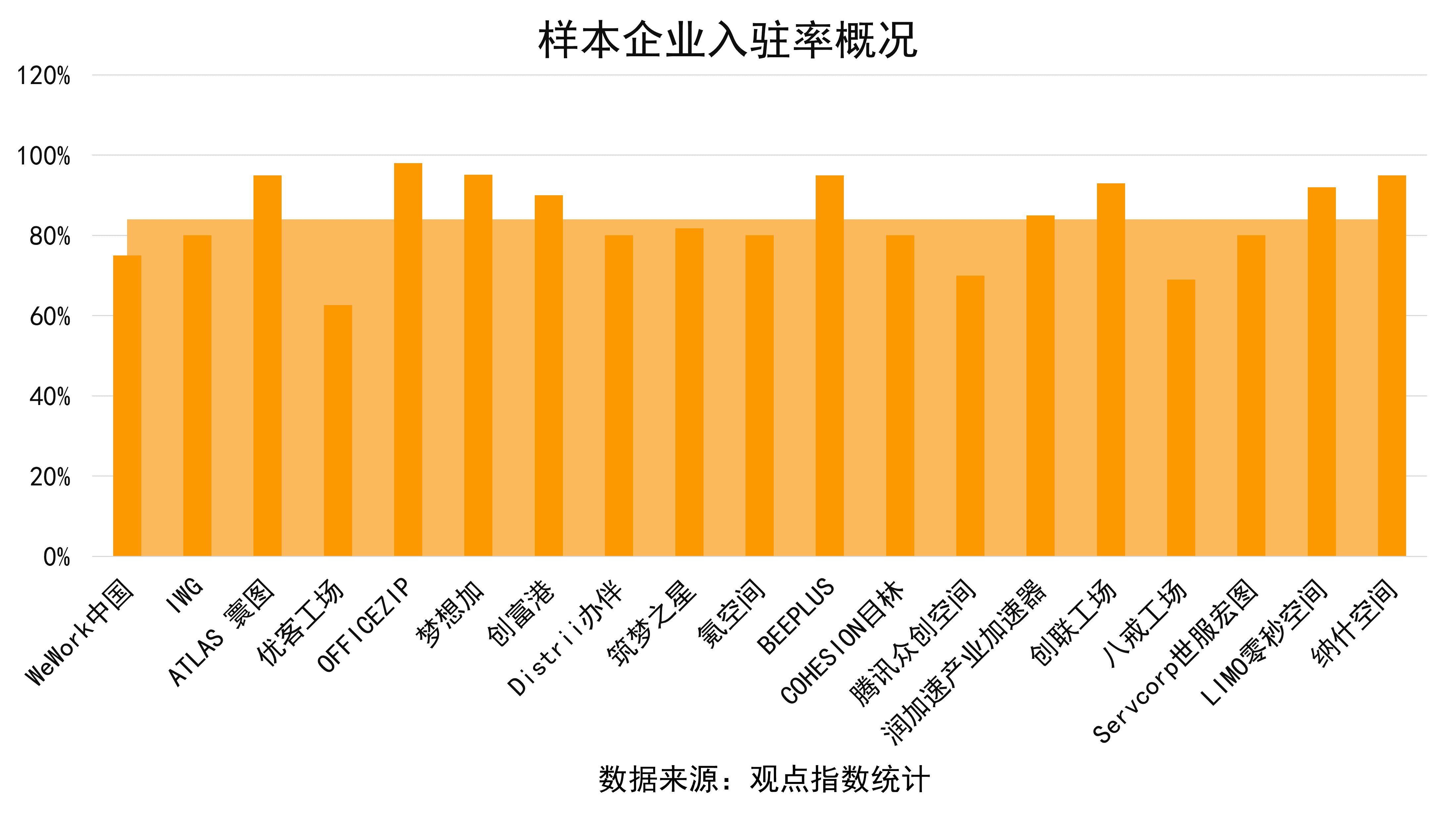 出租率超90%以上,處于較高水平的主要有ATLAS寰圖、OFFICEZIP、創(chuàng)富港、夢想加和BEEPLUS等企業(yè)。入駐率水平的高低與招商積極度與能力、項(xiàng)目運(yùn)營管理水平等息息相關(guān)。