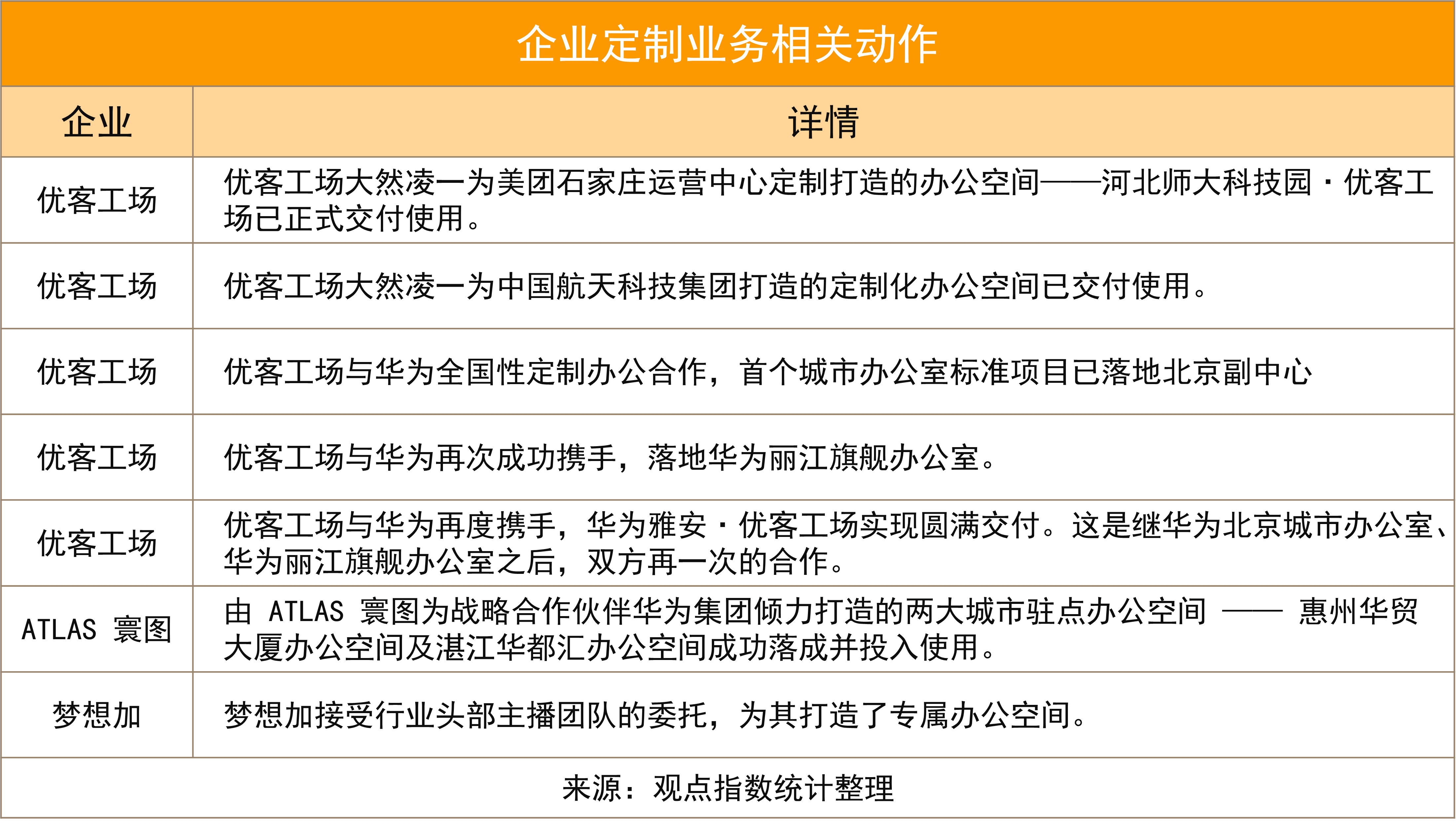 除優(yōu)客工場外,WeWork、夢想加、ATLAS寰圖等辦公空間服務(wù)商對企業(yè)定制業(yè)務(wù)的發(fā)展也愈加重視。企業(yè)定制業(yè)務(wù)優(yōu)勢在于提供一站式定制,節(jié)約成本的同時(shí)換來更高效的服務(wù)。