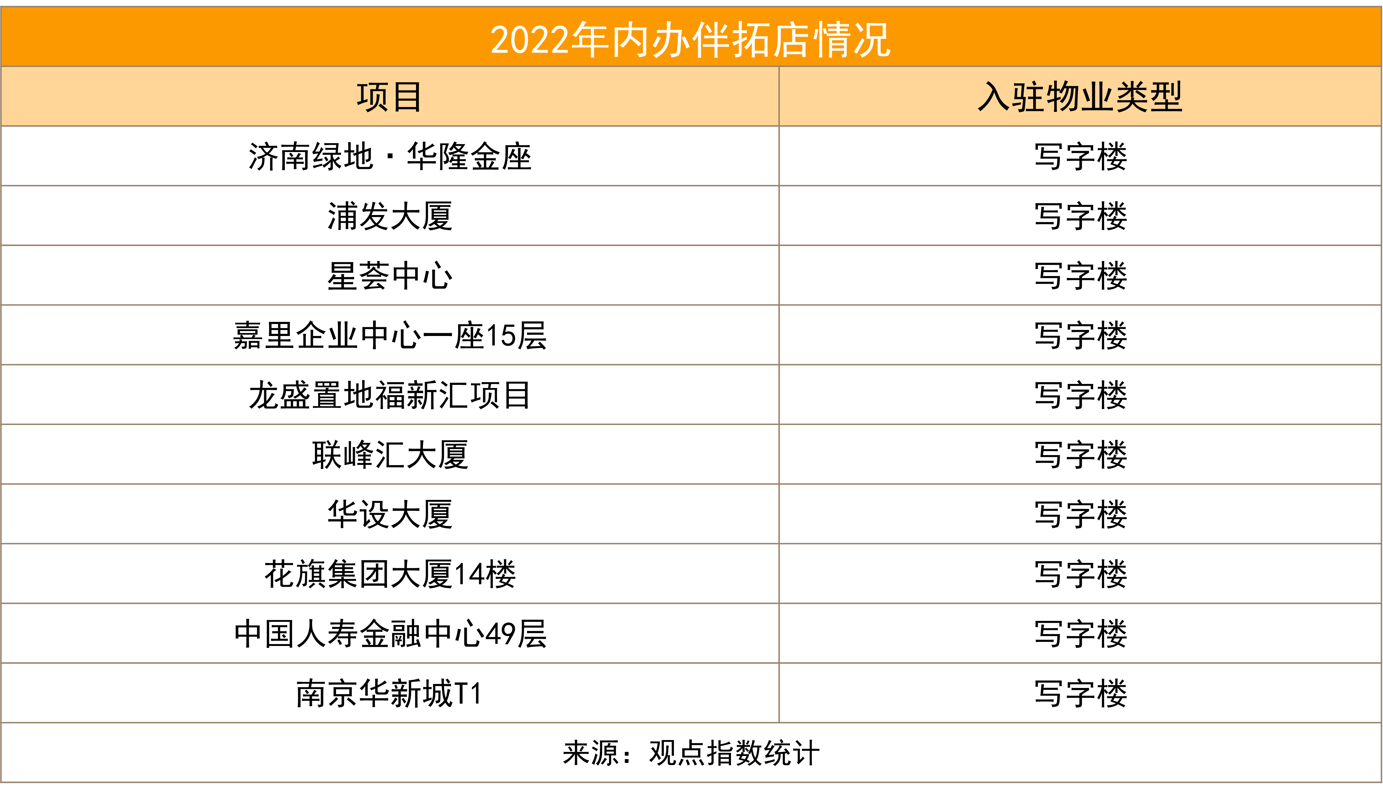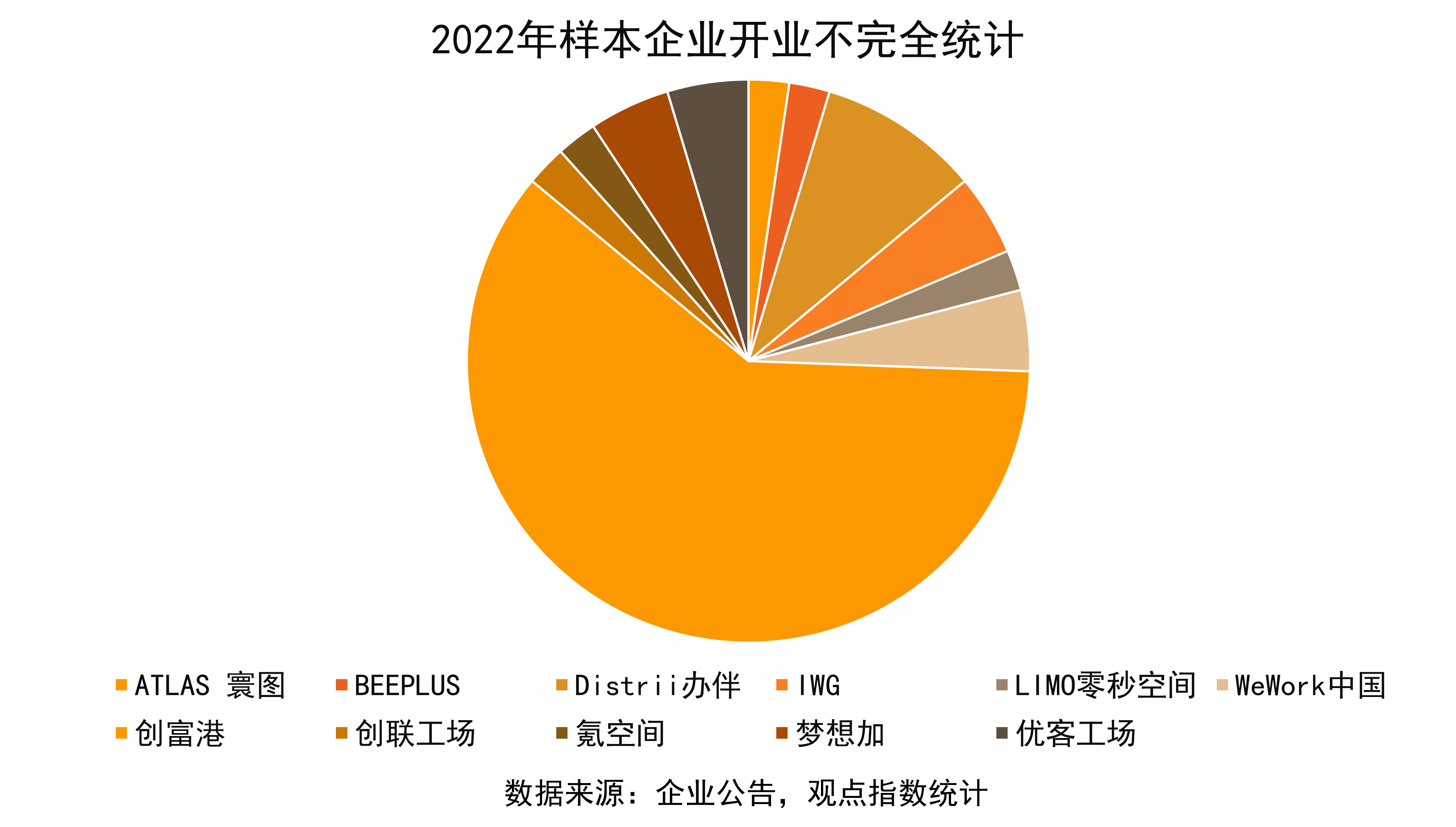 據(jù)觀點(diǎn)指數(shù)不完全統(tǒng)計(jì),2022年全年樣本企業(yè)新增入市42個(gè)辦公空間項(xiàng)目,優(yōu)客工場、夢想加、創(chuàng)富港、零秒空間等企業(yè)均有新增項(xiàng)目入市。