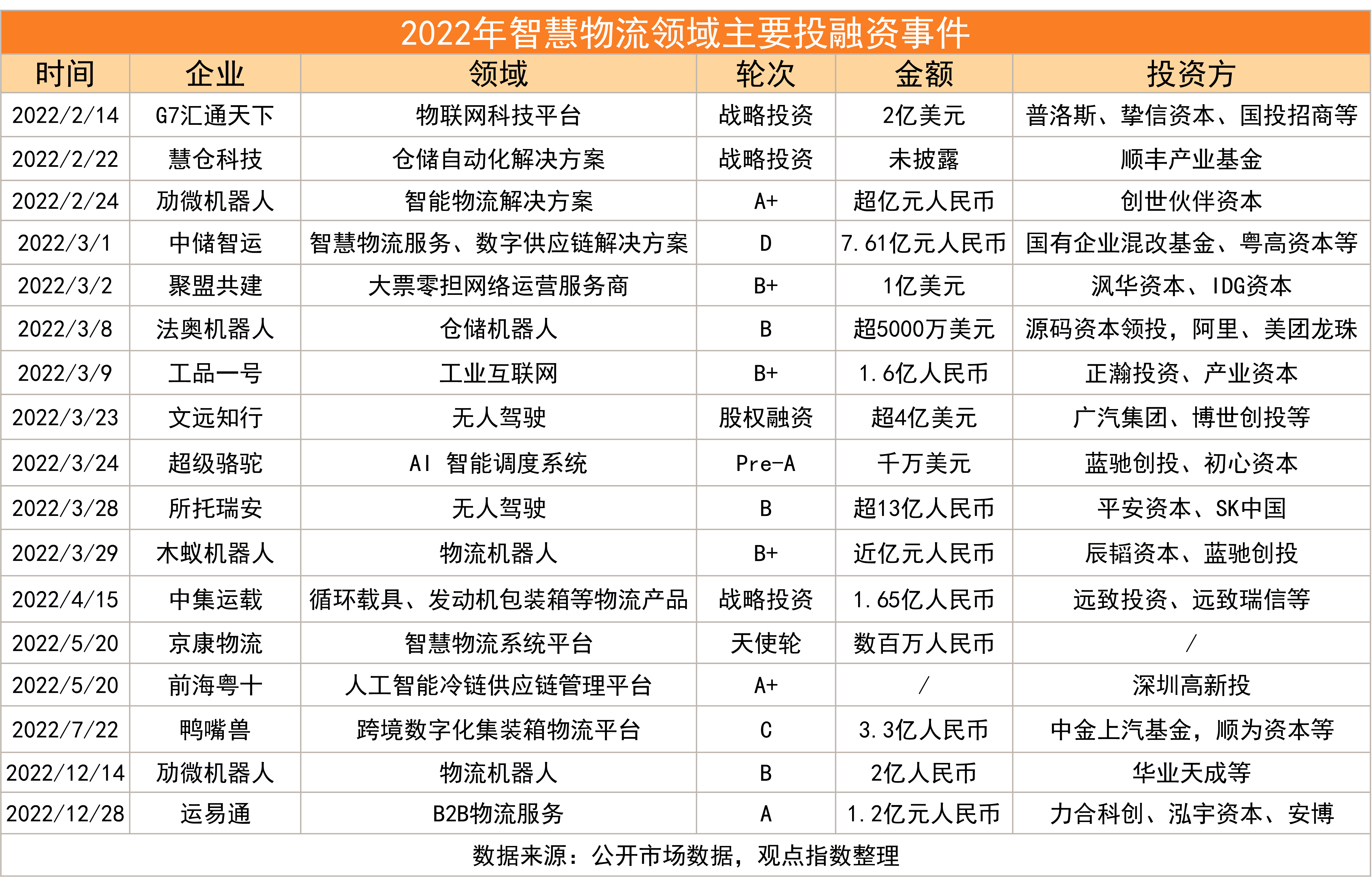 整個2022年,發(fā)生了多起物流科技領域的投融資事件,參與者不乏普洛斯、順豐以及安博??梢钥吹剑度谫Y事件主要集中在機器人、無人駕駛、網(wǎng)絡以及系統(tǒng)平臺領域。