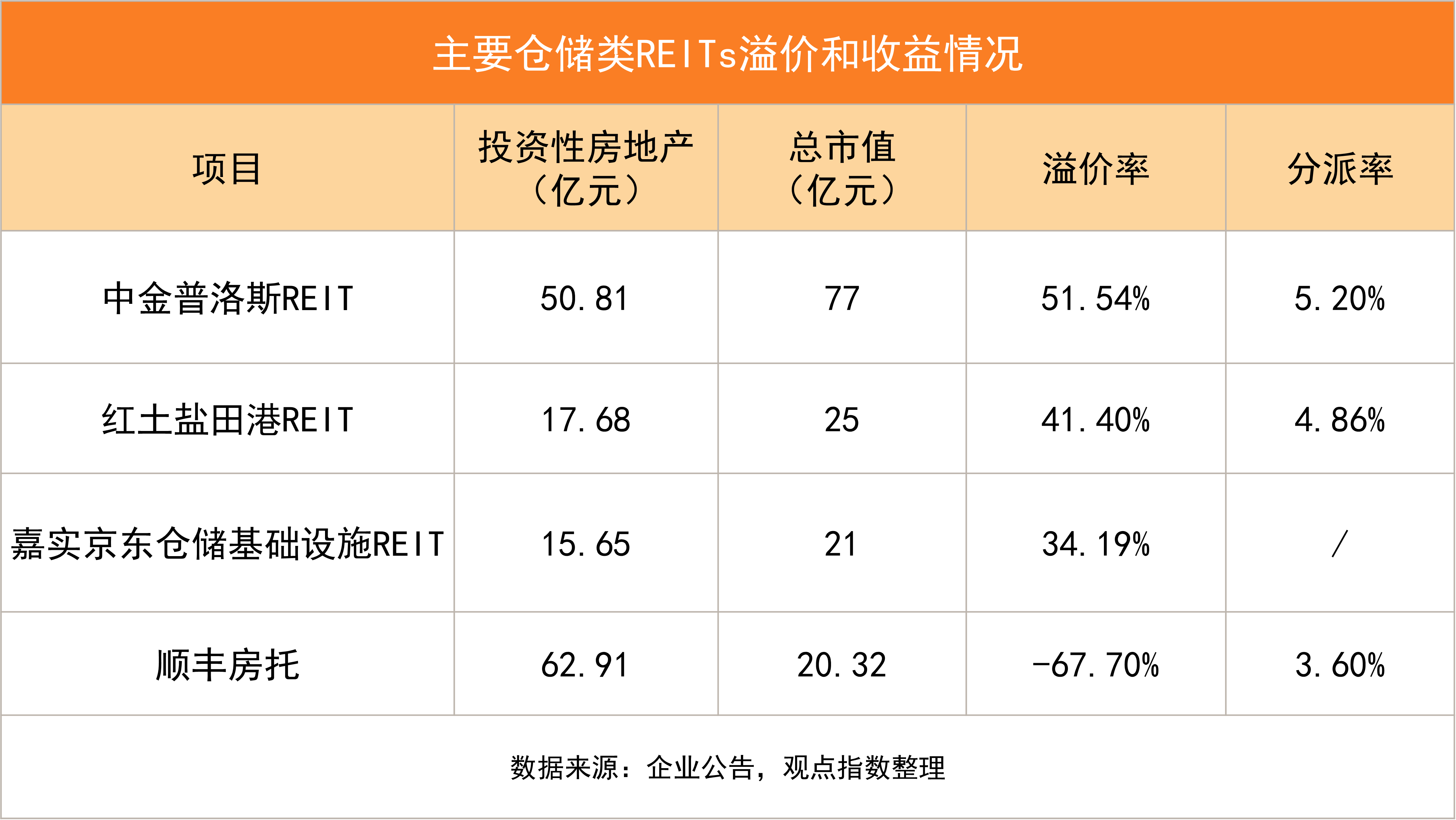 目前內地倉儲類公募REITs共有3只,總市值約123億元,平均溢價率為42%左右,平均分派率約5.03%。