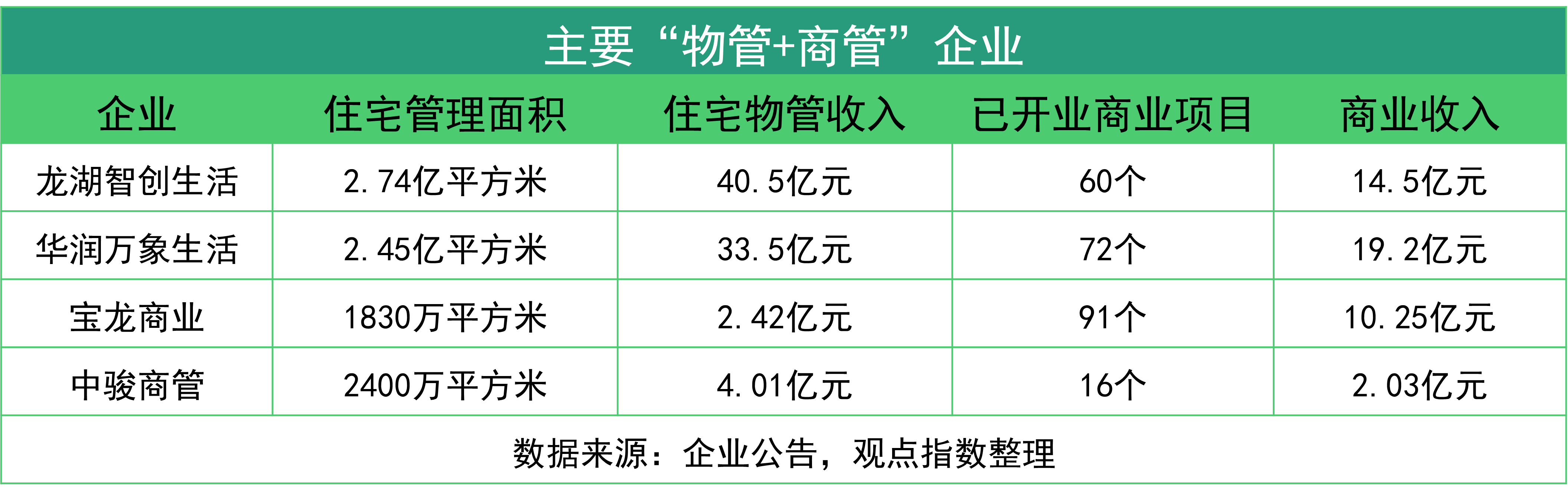 目前,將傳統(tǒng)物業(yè)管理和商業(yè)運(yùn)營共同捆綁上市的企業(yè)眾多,華潤萬象生活、龍湖物業(yè)服務(wù)集團(tuán)、寶龍商業(yè)、中駿商管為其中的代表。