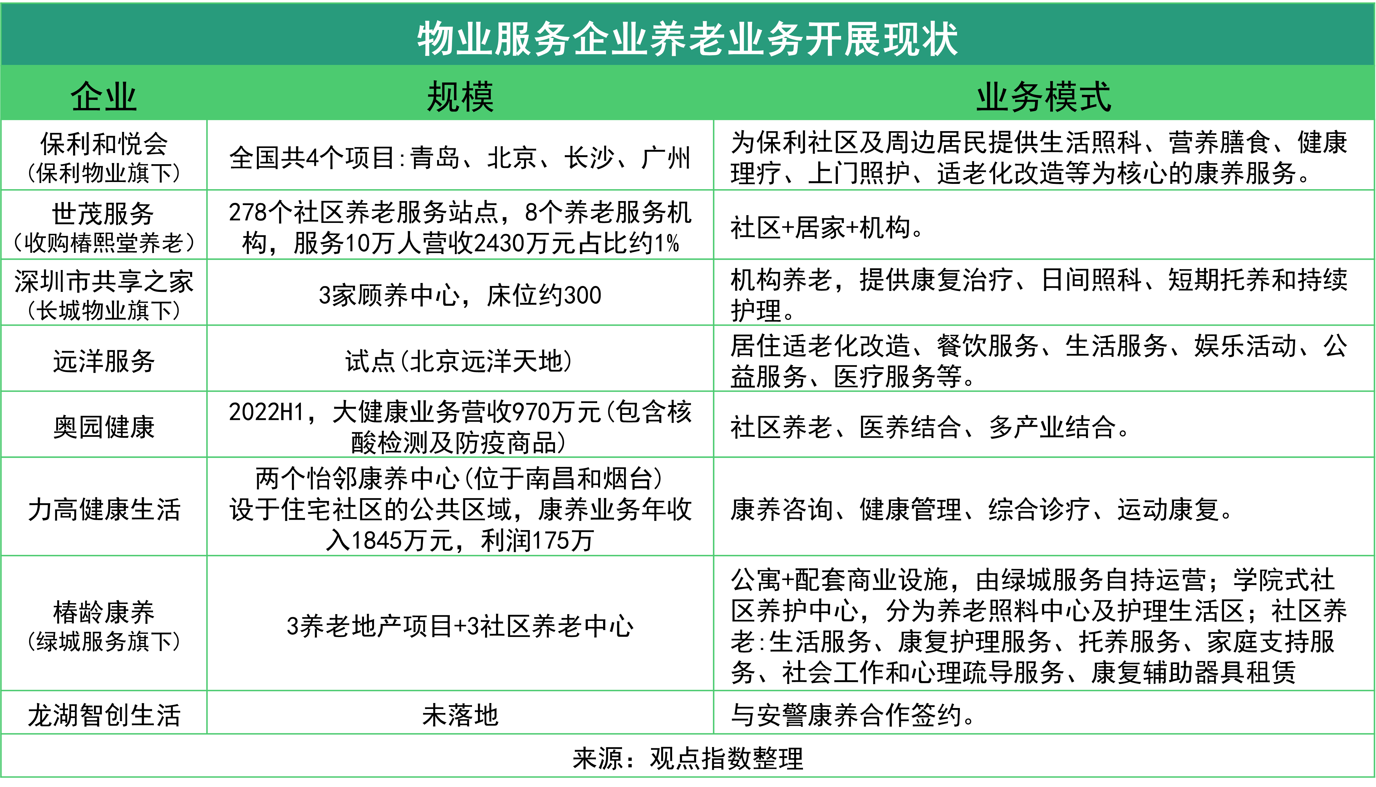 以養(yǎng)老服務(wù)為例,地產(chǎn)行業(yè)養(yǎng)老業(yè)務(wù)大部分由地產(chǎn)下屬的單獨(dú)企業(yè)進(jìn)行,將養(yǎng)老業(yè)務(wù)并入物管企業(yè)者較少,目前物管企業(yè)開展養(yǎng)老業(yè)務(wù)已有一定進(jìn)展,部分偏公益性質(zhì),實(shí)際產(chǎn)生效益的并不多,今后更為現(xiàn)實(shí)的服務(wù)模式可能是與傳統(tǒng)養(yǎng)老機(jī)構(gòu)合作,在社區(qū)進(jìn)行業(yè)務(wù)推廣。