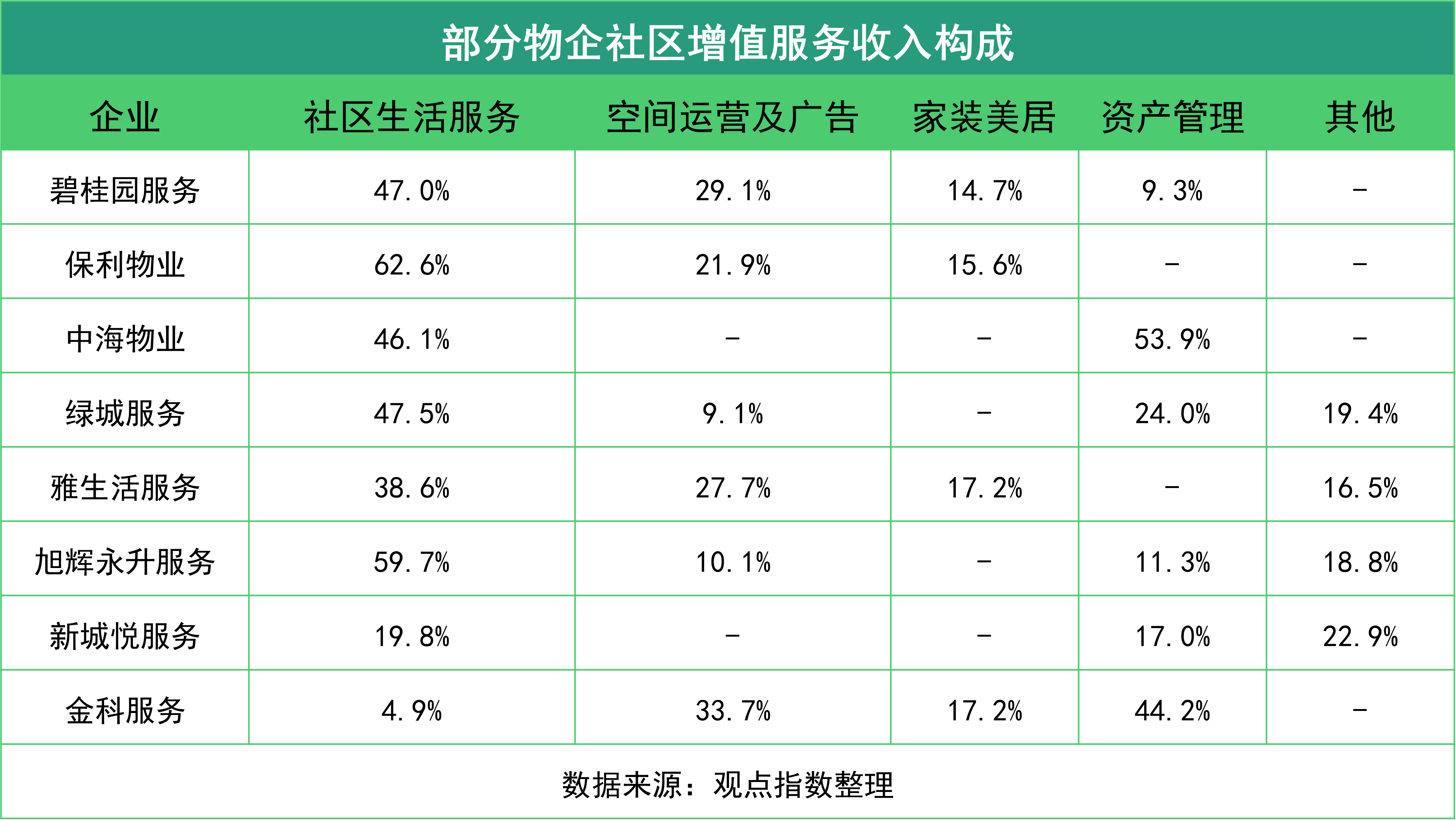 觀點(diǎn)指數(shù)認(rèn)為,本輪房地產(chǎn)行業(yè)銷售和信用周期調(diào)整對物業(yè)服務(wù)行業(yè)的結(jié)構(gòu)性調(diào)整是深遠(yuǎn)的,物管行業(yè)內(nèi)通過并購整合增加了集中度,獨(dú)立性也被進(jìn)一步提上日程。