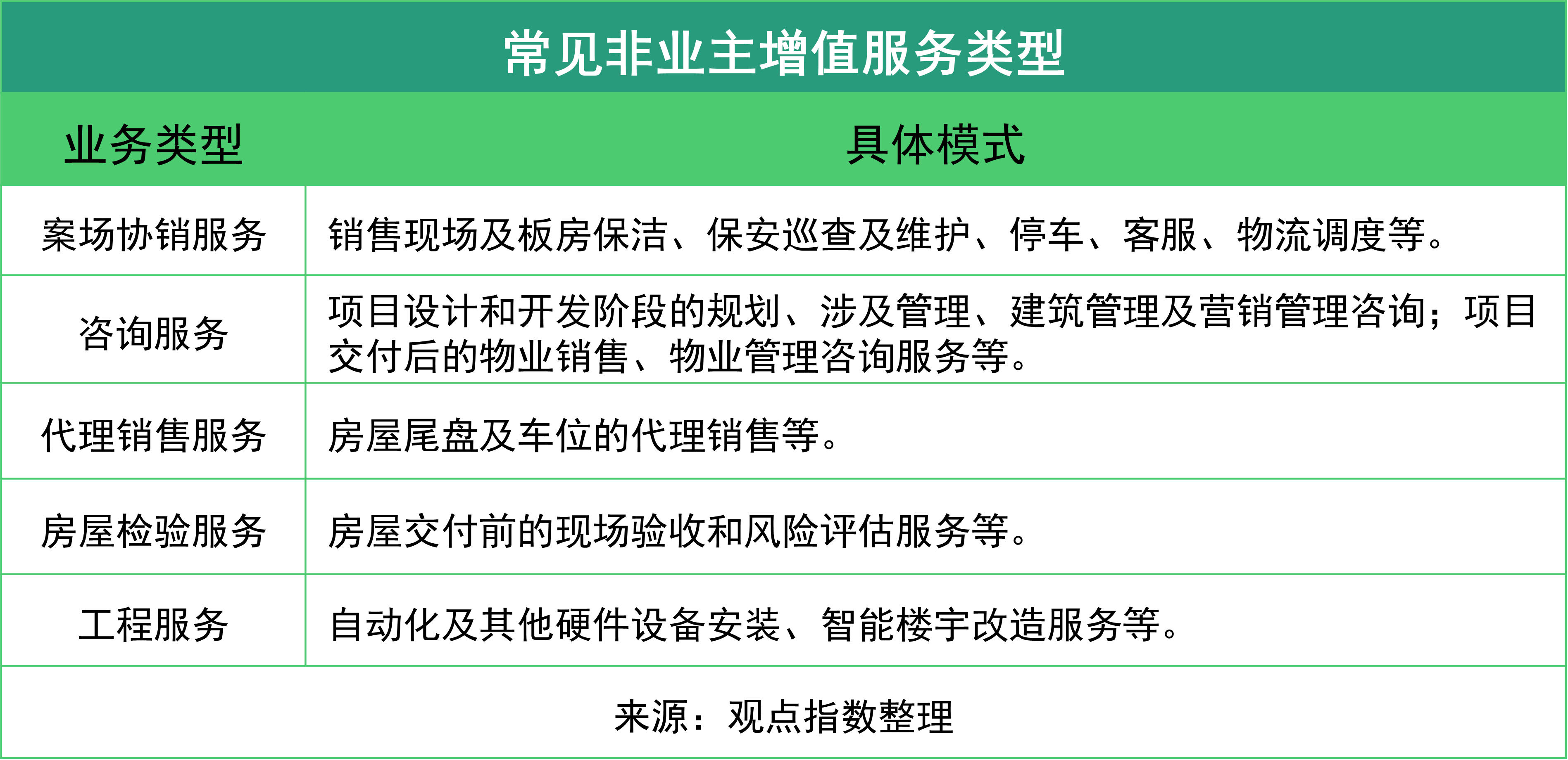非業(yè)主增值服務(wù)多發(fā)生在交付前后,主要包含協(xié)銷服務(wù)、咨詢服務(wù)和工程服務(wù)等,和多樣化程度較高的社區(qū)增值服務(wù)相比,非業(yè)主增值服務(wù)業(yè)務(wù)門檻較低、同質(zhì)化程度也高,能力要求相對較高的主要是工程服務(wù),包含設(shè)備一體化運(yùn)營和各類硬件設(shè)備的安裝改造等。值得注意的是,工程服務(wù)有時會延續(xù)到交付之后,因此在一定程度上提供了一定量的售后維修服務(wù)。