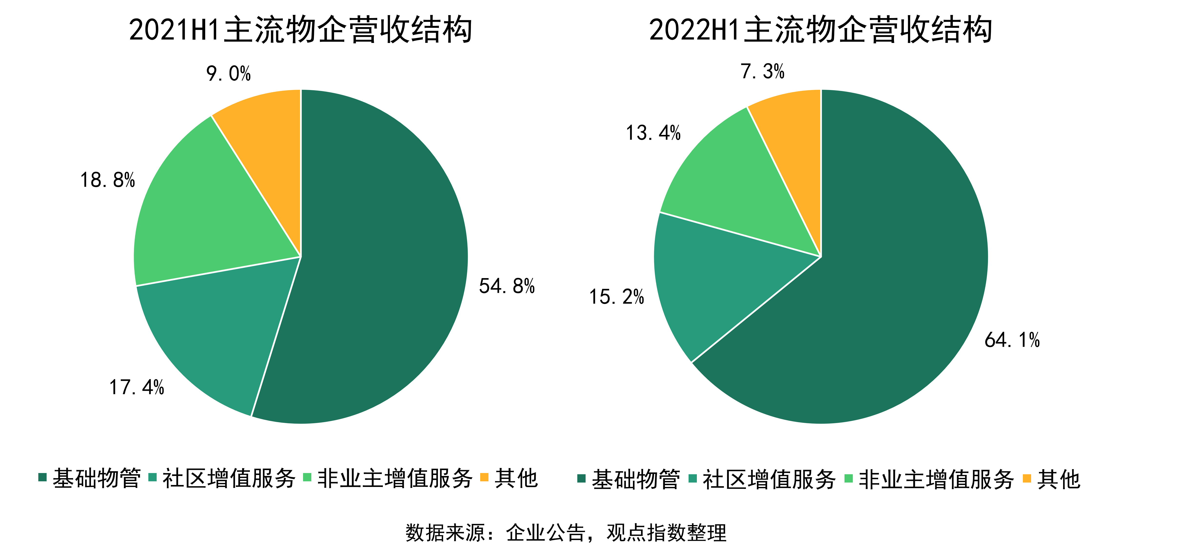 2022年上半年,超一半物企的非業(yè)主增值服務(wù)營收出現(xiàn)下滑,各板塊收入比重也發(fā)生了明顯變化,其中物業(yè)服務(wù)企業(yè)基礎(chǔ)物管在本輪周期中表現(xiàn)穩(wěn)固,占收入的比重也明顯上升,這將為物企之后的增長和業(yè)績筑造更為堅(jiān)實(shí)的底部。