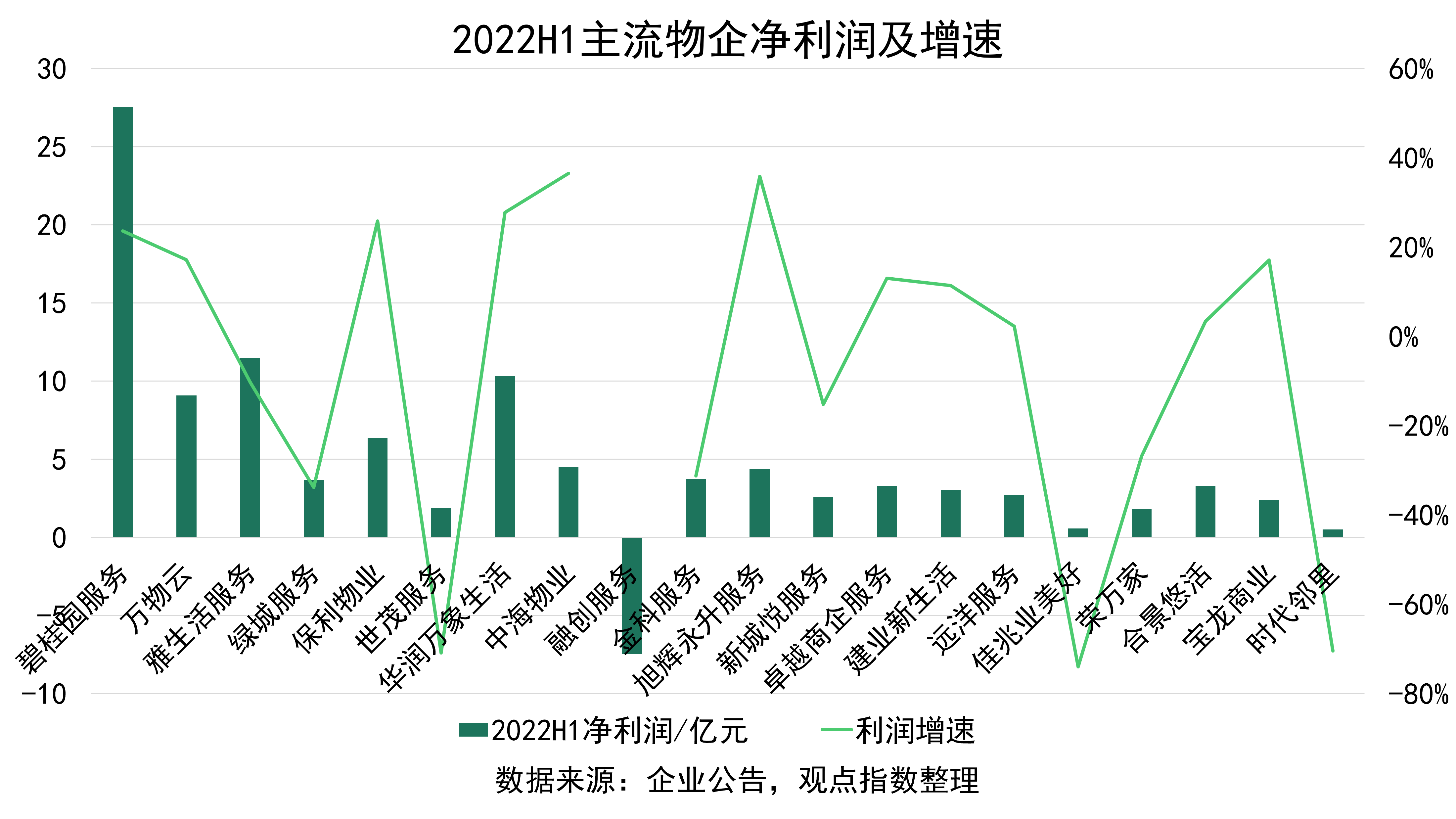 利潤方面,物企受環(huán)境和周期波動的影響則更為明顯,樣本上市物企平均凈利潤不增反減,平均跌幅達(dá)7.9%,增收不增利的現(xiàn)象突出。30家主流樣本物業(yè)企業(yè)中僅9家利潤增幅超過20%,且其中絕大多數(shù)為國資物企,共12家出現(xiàn)利潤縮水,而融創(chuàng)服務(wù)甚至產(chǎn)生了數(shù)億元虧損,整體表現(xiàn)和過去數(shù)年的高歌猛進(jìn)大相徑庭。
