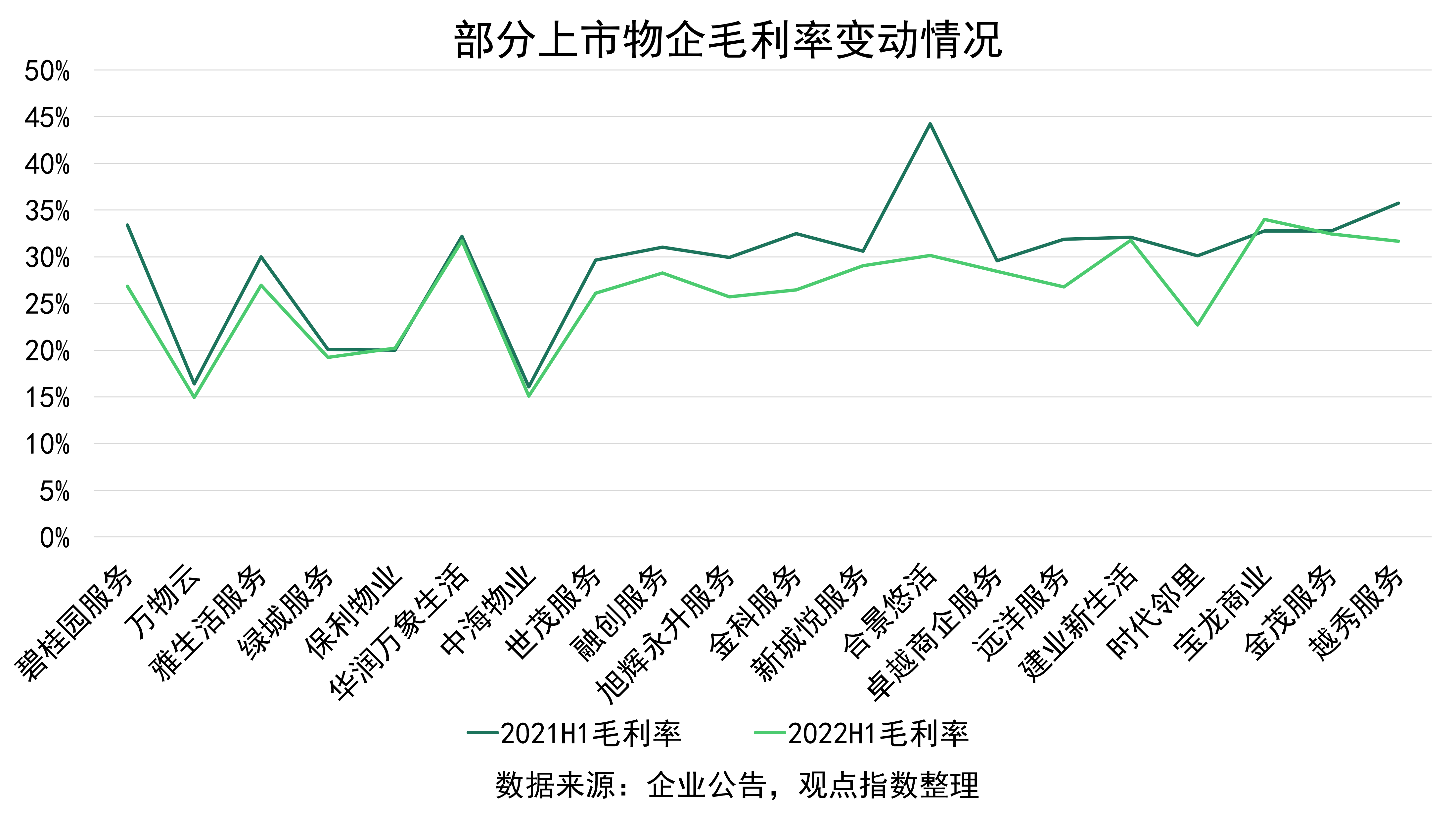 整體利潤率情況則不容樂觀,2022年上半年,上市物企平均毛利率為26%,和上年同期29%相比,下降約3個百分點(diǎn)。