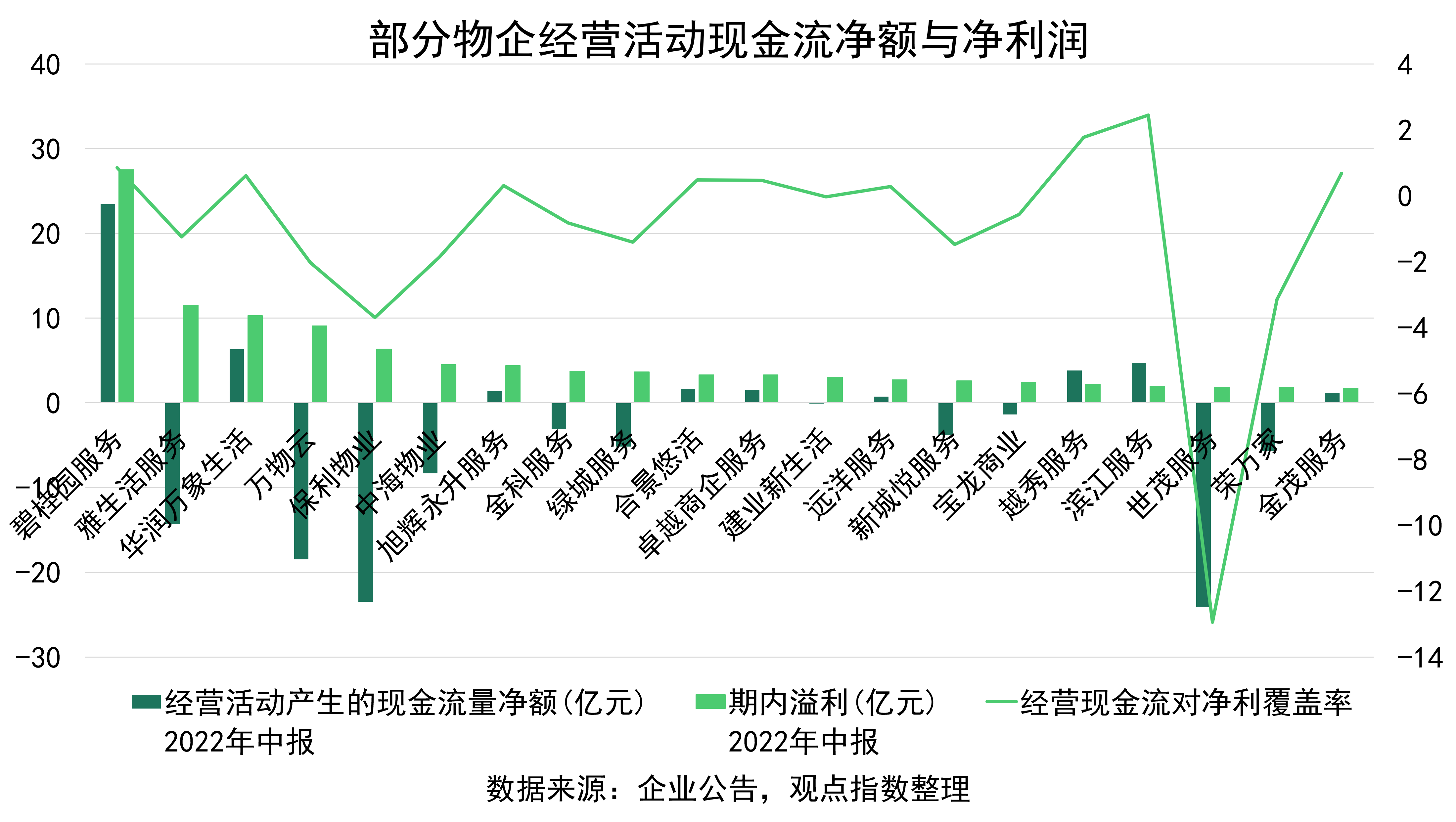 從經(jīng)營現(xiàn)金流方面看,大多數(shù)上市物企都無法實(shí)現(xiàn)經(jīng)營現(xiàn)金流凈額對凈利潤的覆蓋,僅濱江服務(wù)、越秀服務(wù)等少數(shù)物企表現(xiàn)尚可,經(jīng)營凈現(xiàn)對凈利潤覆蓋率分別達(dá)到了2.4倍、1.8倍,大量物企甚至出現(xiàn)上半年經(jīng)營現(xiàn)金流為負(fù)的狀況。