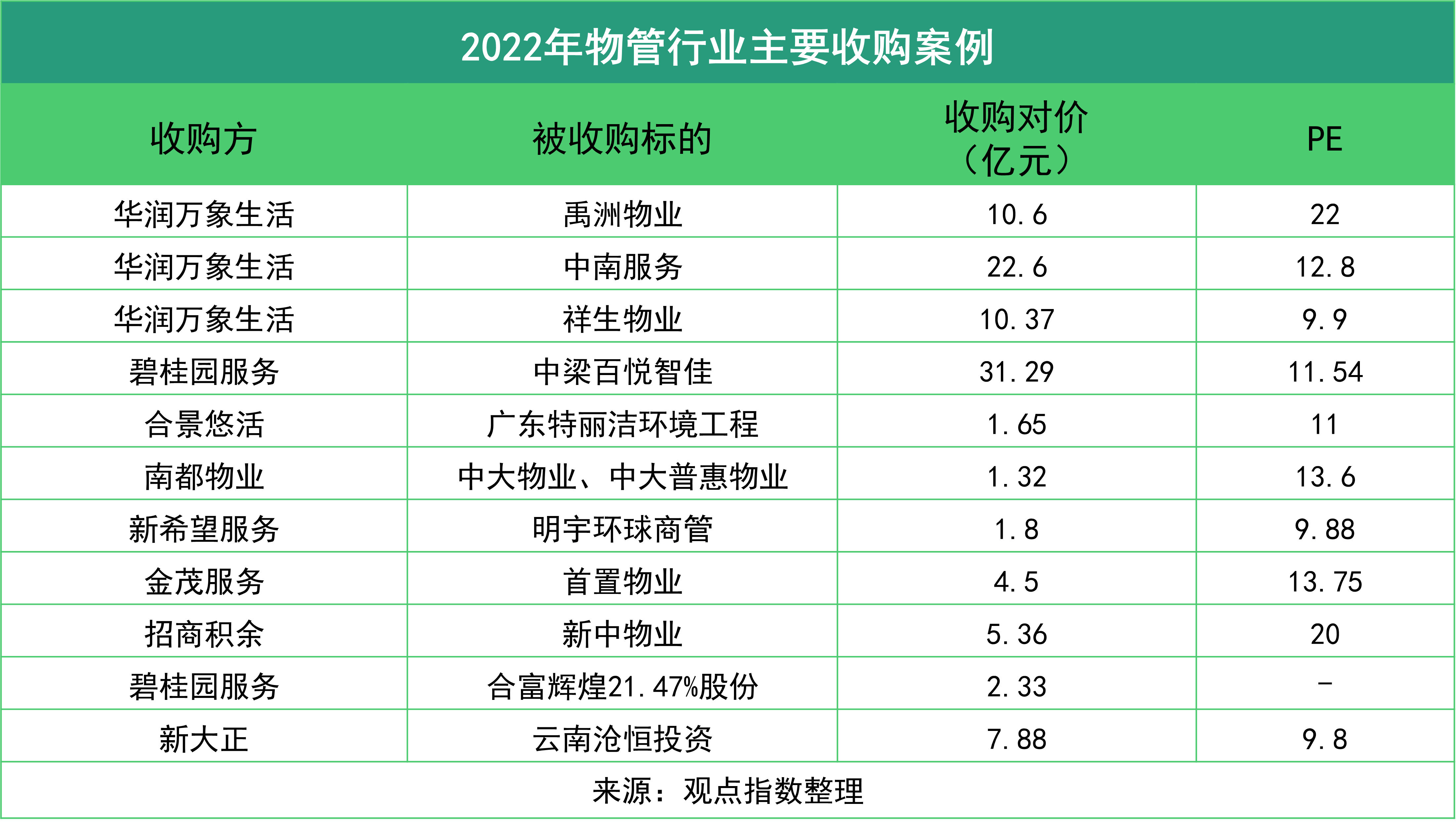 2022年物管行業(yè)并購熱度略有降低,但并未完全降溫,地產(chǎn)下行的同時也為物管行業(yè)提供了大量的優(yōu)良收并購機(jī)遇,而收購對象除同行物管企業(yè)外還包含其他多種業(yè)態(tài)。