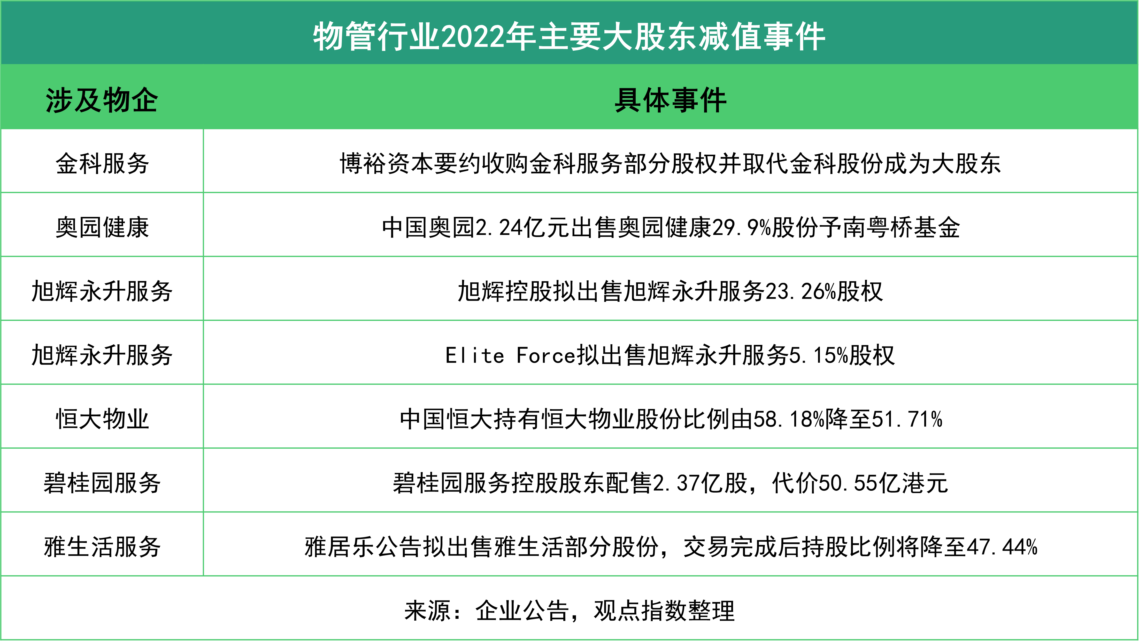 2022年物管行業(yè)發(fā)展進(jìn)程受地產(chǎn)捆綁嚴(yán)重,但亦出現(xiàn)了大量地產(chǎn)方出售旗下物管企業(yè)部分股份的事件,主要原因仍是為了緩解房企自身的債務(wù)危機(jī)。