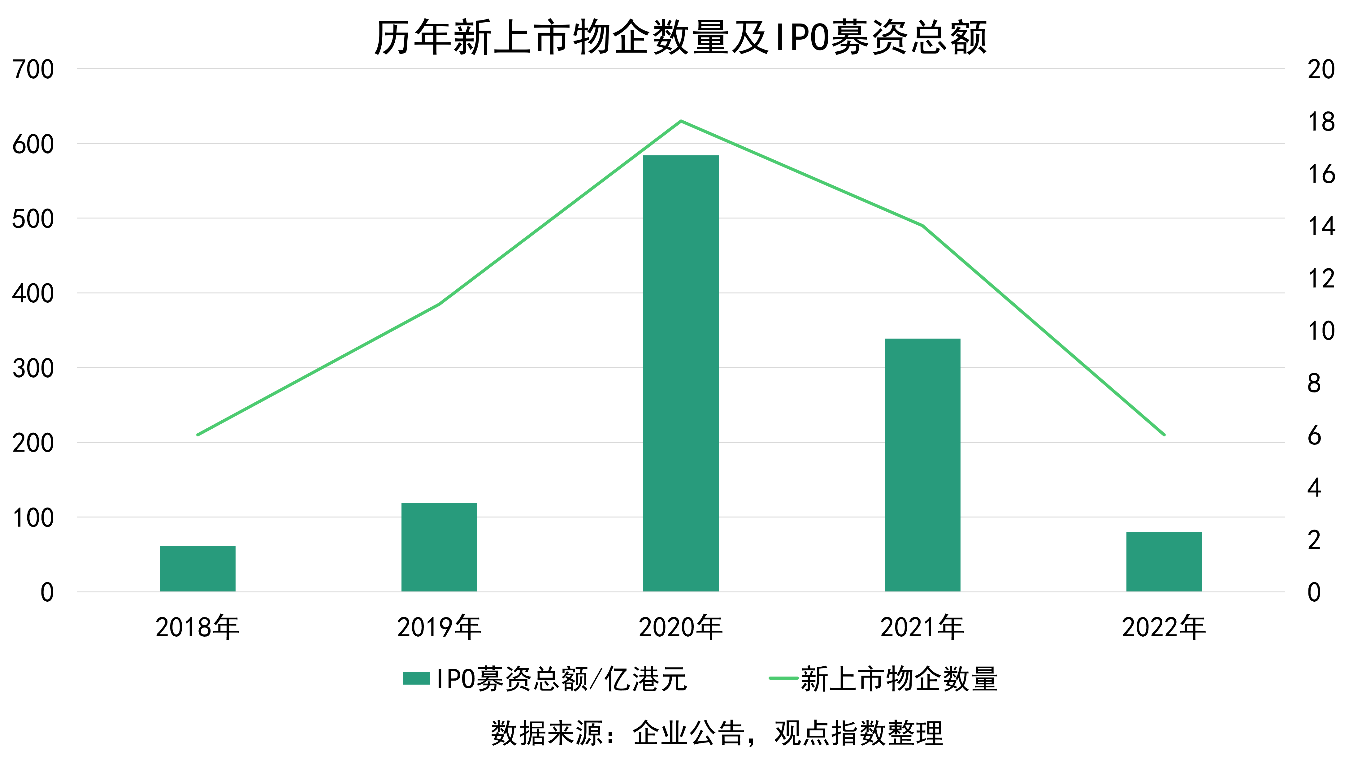 2022年,房企分拆物業(yè)上市熱度大幅減緩,據(jù)觀點(diǎn)指數(shù)統(tǒng)計(jì),全年共有6家物業(yè)企業(yè)順利IPO(均為港股),總募資資金約12.36億元,數(shù)量和募資額上都是自2019年以來熱度最低的一年。