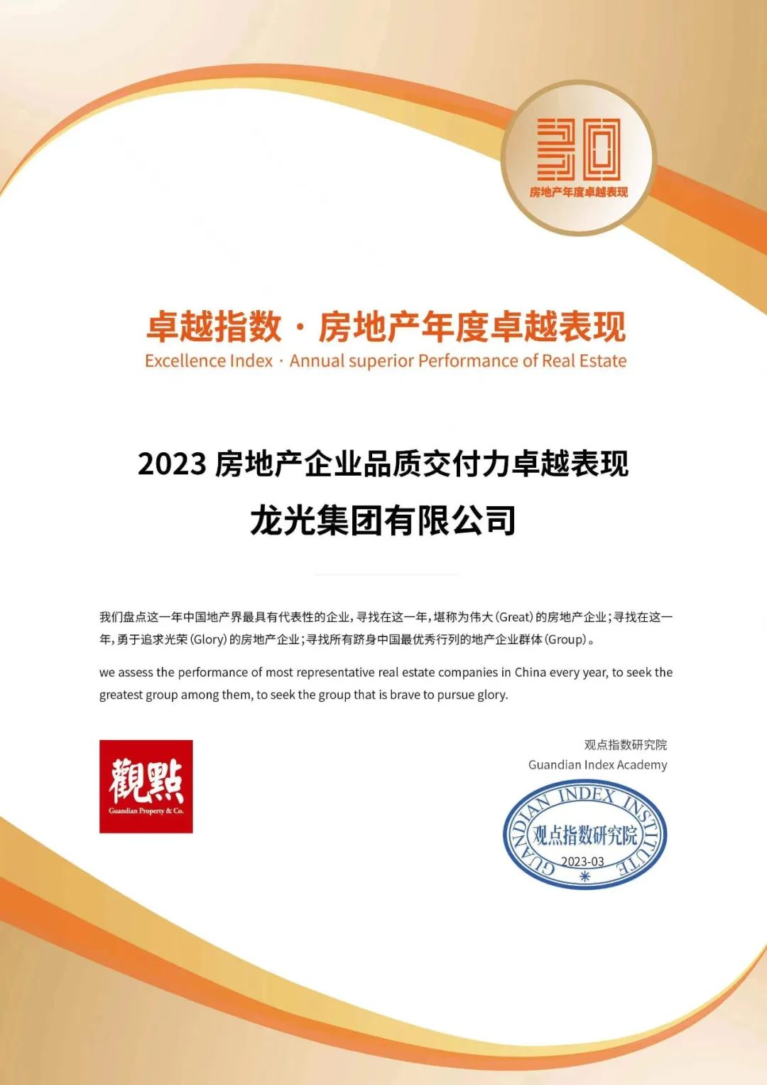 3月22日,由觀點機構(gòu)主辦的2023觀點年度論壇在廣州召開,“卓越指數(shù)·2023房地產(chǎn)年度卓越表現(xiàn)”研究成果重磅發(fā)布。龍光集團憑借突出的產(chǎn)品交付表現(xiàn),榮獲“2023房地產(chǎn)企業(yè)品質(zhì)交付力卓越表現(xiàn)”大獎。