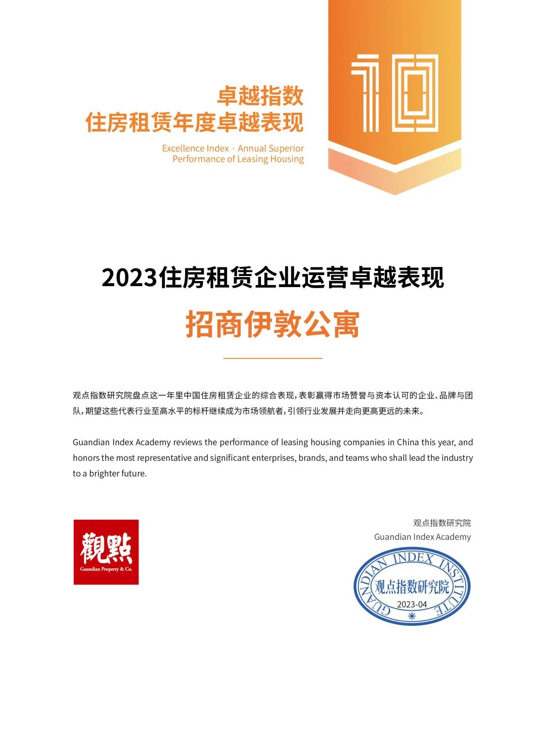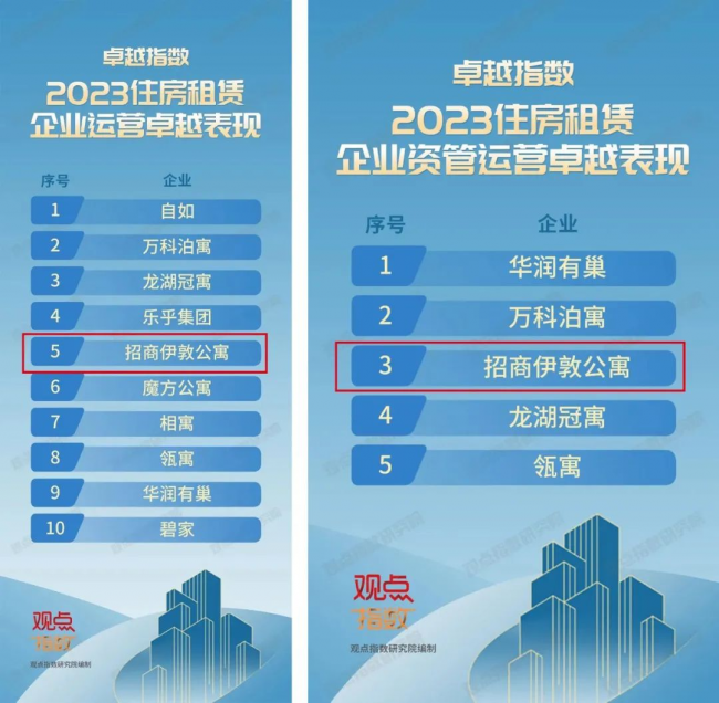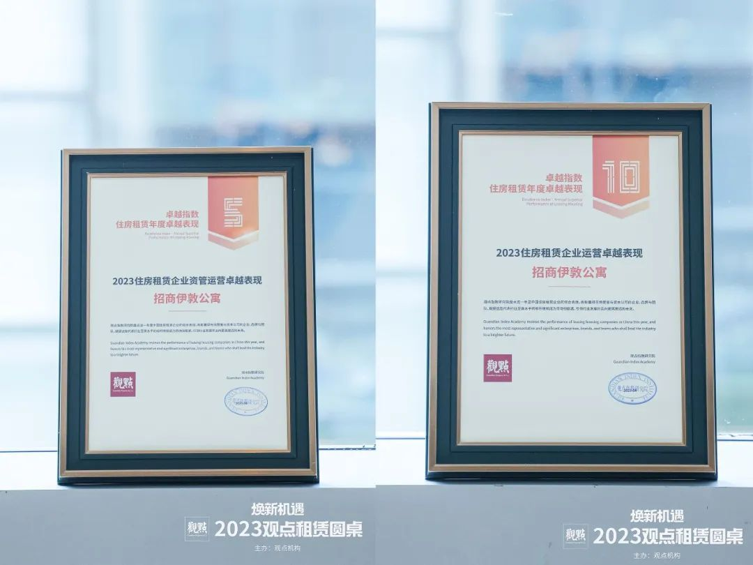 2023年4月18日,觀點(diǎn)指數(shù)研究院獨(dú)家發(fā)布《卓越指數(shù)·2023住房租賃發(fā)展報(bào)告》和“卓越指數(shù)·2023住房租賃企業(yè)運(yùn)營(yíng)卓越表現(xiàn)”研究成果,招商伊敦公寓業(yè)務(wù)板塊憑借突出的運(yùn)營(yíng)表現(xiàn)和過(guò)硬的綜合實(shí)力,榮獲2023住房租賃企業(yè)運(yùn)營(yíng)卓越表現(xiàn)獎(jiǎng)、2023住房租賃資管運(yùn)營(yíng)卓越表現(xiàn)獎(jiǎng)兩項(xiàng)重要獎(jiǎng)項(xiàng),并且均位列榜單前五,獲得行業(yè)高度認(rèn)可。