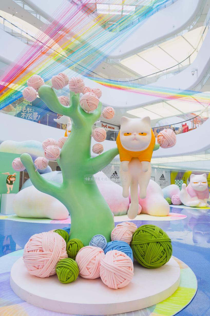20米高、以燈光流淌形態(tài)呈現(xiàn)的水流飛瀑裝置,高懸天頂、隨風(fēng)肆意擺動的彩虹天幕,特色裝置與日落燈一起上陣的表演舞臺、巧妙置景的集裝箱式CUTE版新車展示,朵朵巨大花球車集結(jié)而成的創(chuàng)意市集,以及兩側(cè)靜靜等待開門營業(yè)的店鋪們……