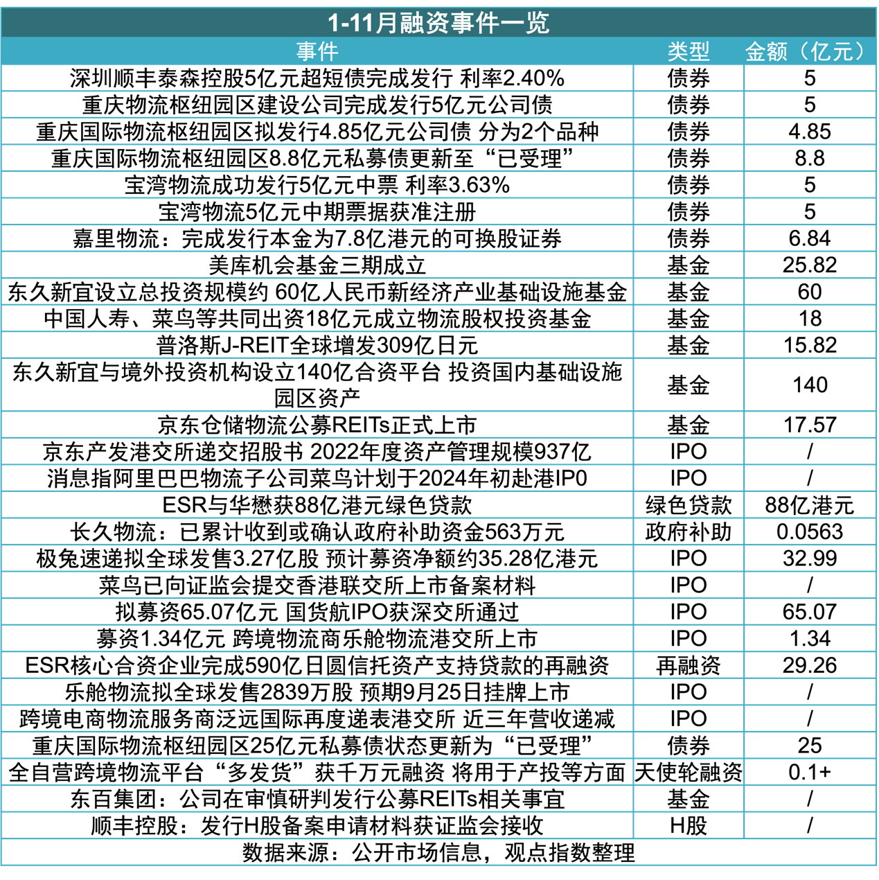 期內(nèi),觀點指數(shù)錄得主要融資事件共計28起,披露總金額為551.9億元;其中債券發(fā)行8起,披露金額為65.49億元;基金設立7起,披露金額為277.21億元;IPO事件9起。