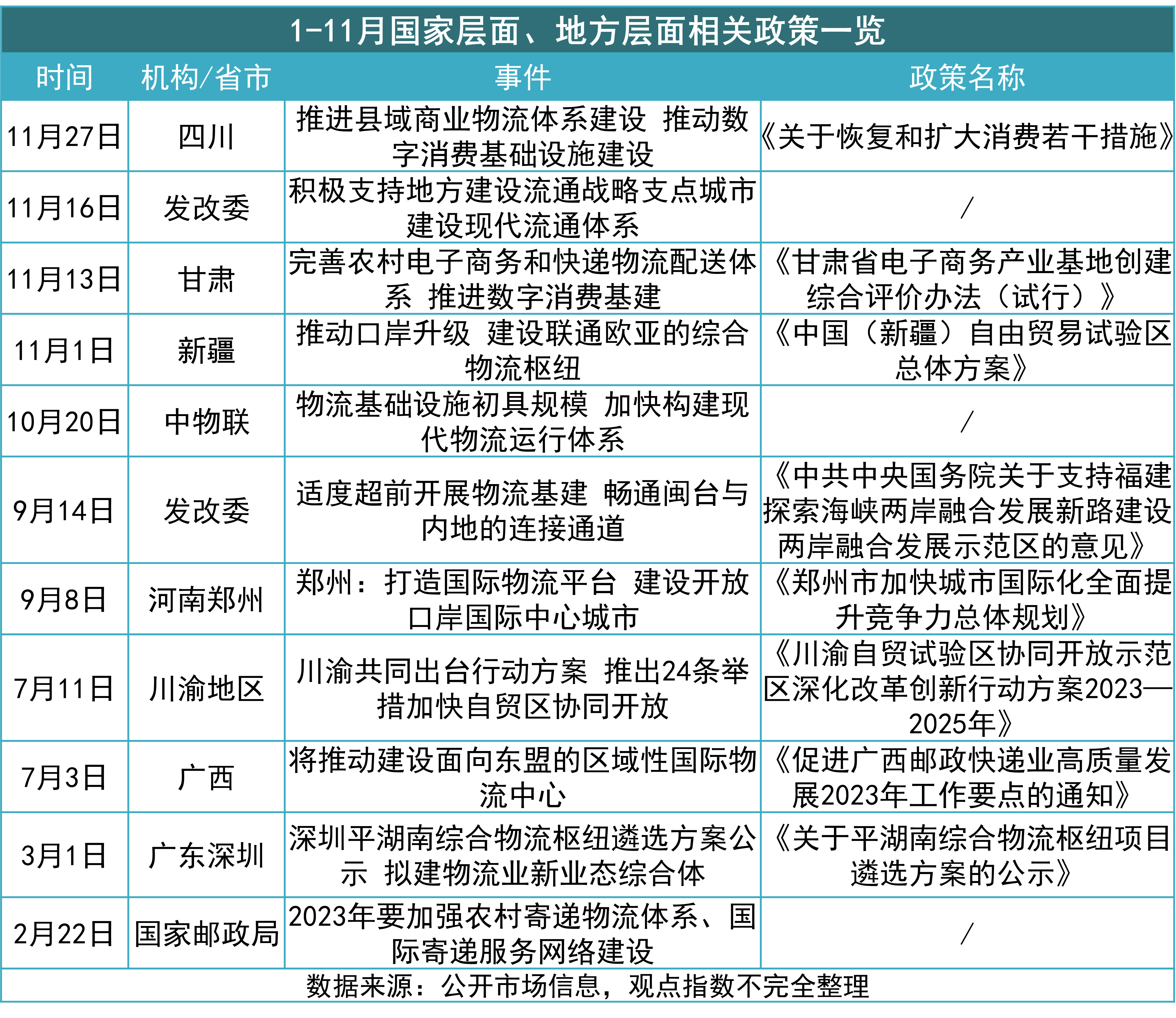 其中,1-11月共錄得10起國家與地方層面相關政策的頒布。可以發(fā)現(xiàn),從下半年開始政策從構建物流流通體系、建設綜合物流樞紐著手促進。