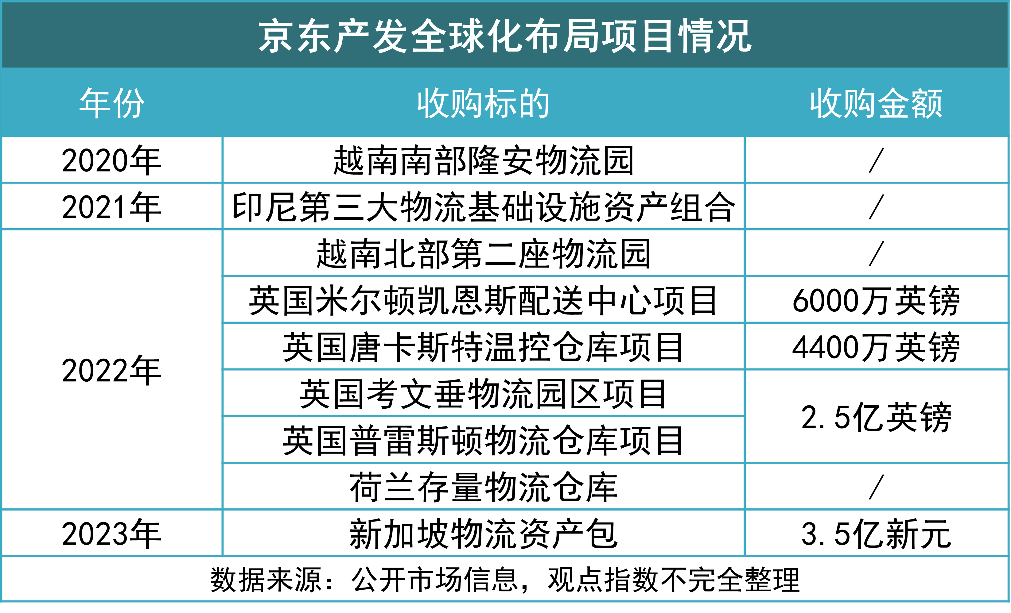 京東產(chǎn)發(fā)在2020年公布全球化布局后,據(jù)觀點指數(shù)統(tǒng)計,其近三年已先后收購了位于越南、印尼、英國、荷蘭等國家的多處物流倉儲項目,其中英國的收購項目數(shù)量最多。