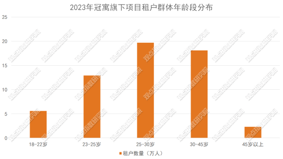 客戶群體來看,25歲到30歲群體成為冠寓旗下住房租賃項目的租戶中堅力量,數(shù)量約19.7萬人,占比33.62%。23歲到25歲和30歲到45歲同樣是冠寓重要的租戶來源,比重分別為22.01%和30.89%。