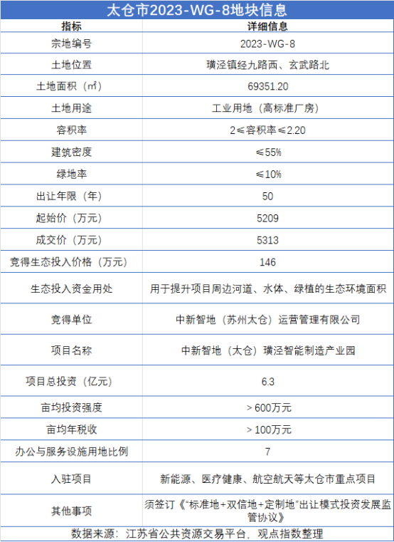 不僅如此,綠色生態(tài)方面的沉淀也擴大了中新集團在拿地上的優(yōu)勢。2023年上半年,中新集團成功摘得中新智地(太倉)璜涇智能制造產(chǎn)業(yè)園項目土地,該地塊是全國首宗限地價“競生態(tài)投入”產(chǎn)業(yè)用地。