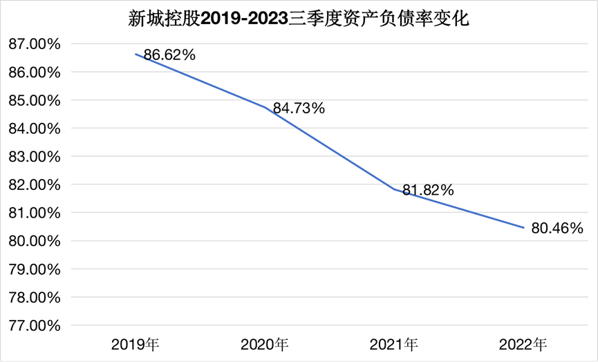 從負(fù)債率角度觀察,新城債務(wù)水平較為平穩(wěn),自2019年以來資產(chǎn)負(fù)債率維持在80%左右,并呈現(xiàn)逐年下降趨勢(shì)。其中,2019年為86.62%,2023年第三季度下降至78.62%。