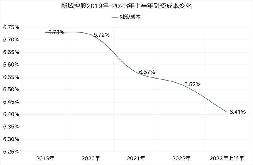 近年來,新城融資成本數(shù)據(jù)無較大波動(dòng),2019-2022年分別為6.73%、6.72%、6.57%及6.52%,2023年中期進(jìn)一步降至6.41%,較上年同期下降0.09個(gè)百分點(diǎn)。