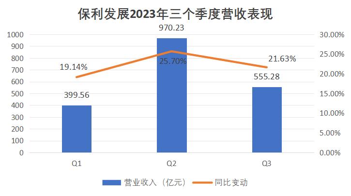 銷售表現(xiàn)反映到財(cái)報(bào)上,2023年前三個(gè)季度,保利發(fā)展?fàn)I業(yè)收入為1925.06億元,同比增長23.10%。三個(gè)季度業(yè)績均同比提升,特別是Q2業(yè)績,漲幅達(dá)25.70%。