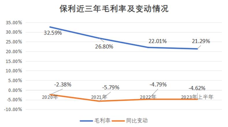 自2020年,保利發(fā)展毛利率逐年下降,2021年更是同比下降5.79%,也是這一年開始增收不增利,而營收也在2022年出現(xiàn)下滑。