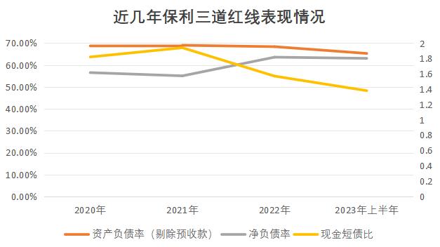 作為房企中的優(yōu)等生,保利發(fā)展在三道紅線上的表現(xiàn)一直維持在綠檔水平。截止到2023年三季度末,公司資產(chǎn)負(fù)債率為76.76%,較上年度末下降1.35個(gè)百分點(diǎn);剔除合同負(fù)債后的資產(chǎn)負(fù)債率則下降3.3%至66.3%;凈負(fù)債率約61.60%。