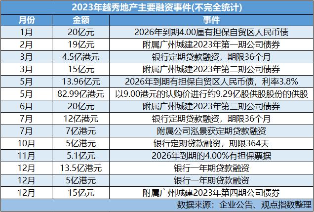 下半年以來,越秀地產于7月通過附屬公司泓景獲7億港元定期貸款融資;同月再獲一家銀行12億港元定期融資,期限為36個月;9月獲授6億港元定期貸款融資;10月獲5億港元定期貸款融資,期限364天。