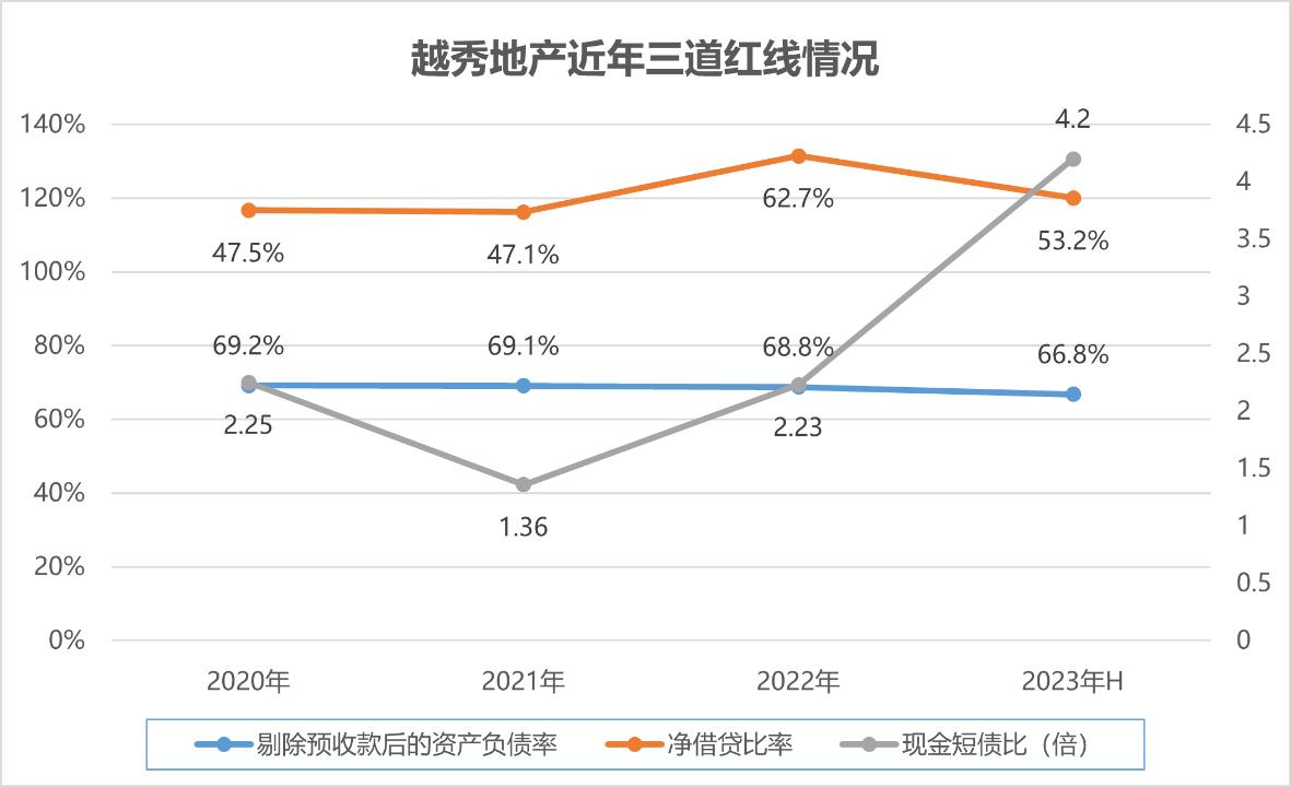 同期末,剔除預收款后的資產負債率、凈借貸比率和現(xiàn)金短債比分別為66.8%、53.2%,有所改善。但主要是因為行業(yè)變化,令越秀地產管理層更多關注在尋求增長之際對債務杠桿實施主動管理。
